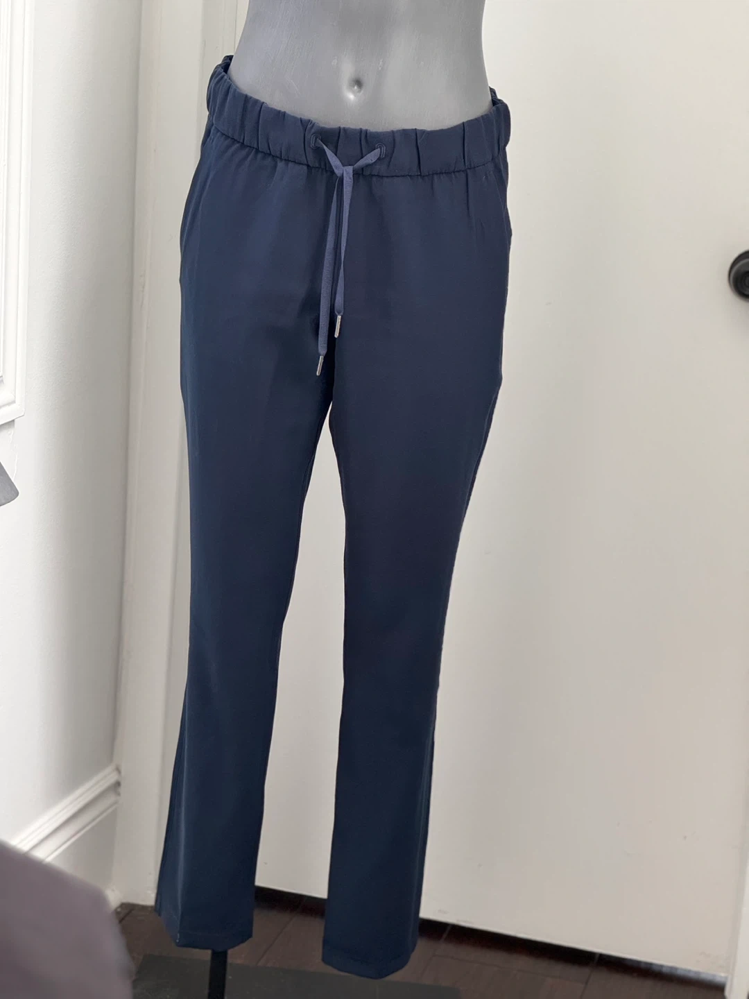 Lululemon pants in a navy blue colour. Size 8. Body is 100% polyester, pocket lining is 86% polyester and 14% elastane.