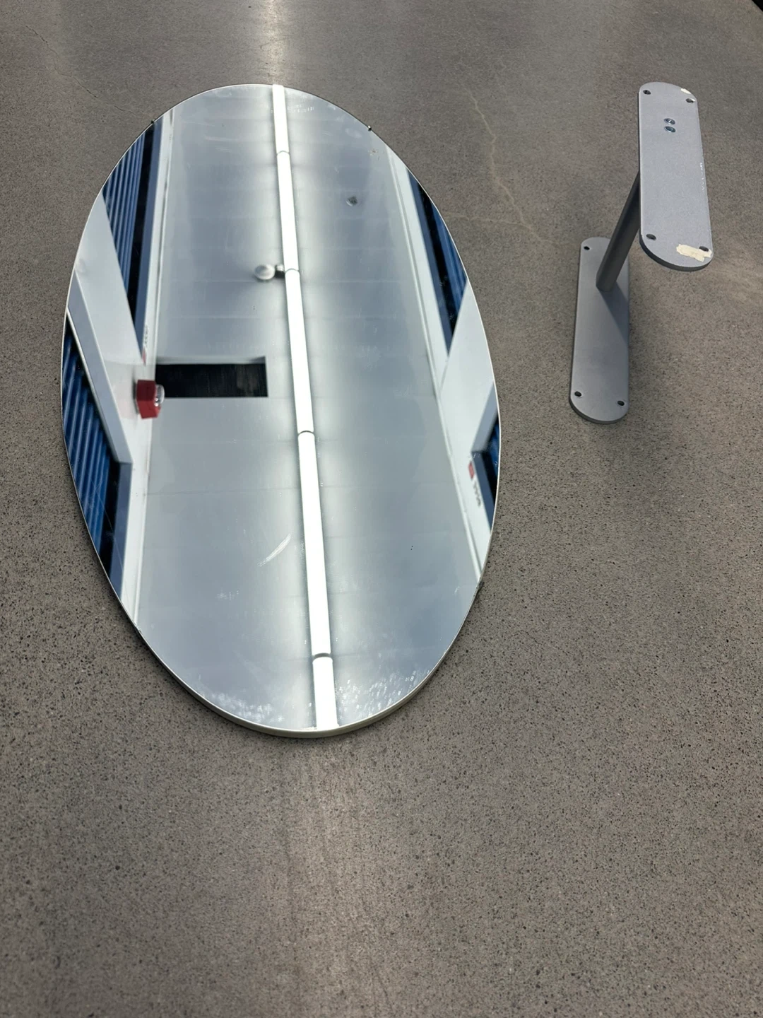 IKEA oval-shaped mirror with attached clothing rod (located behind mirror) that holds the mirror 6” away from the wall. Includes mounting hardware for mirror bracket. The mirror has a simple, modern design.