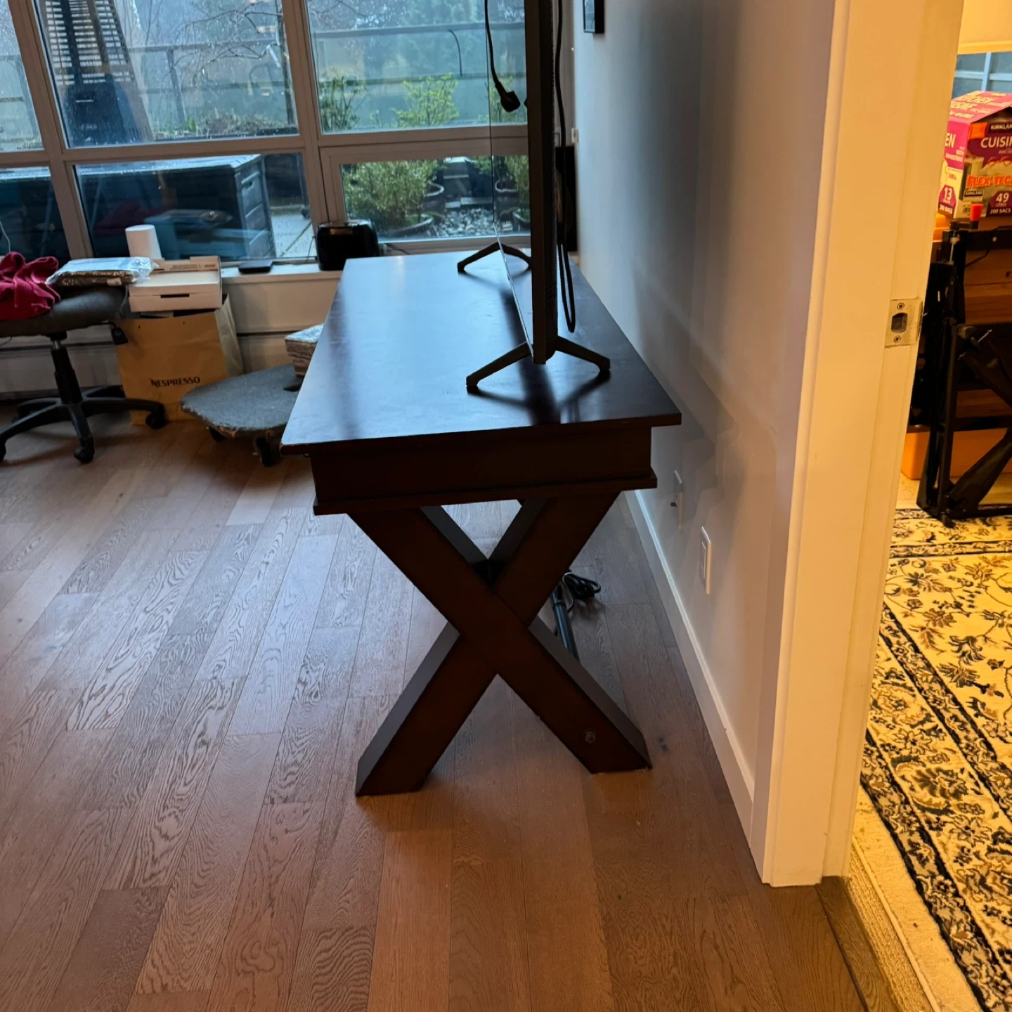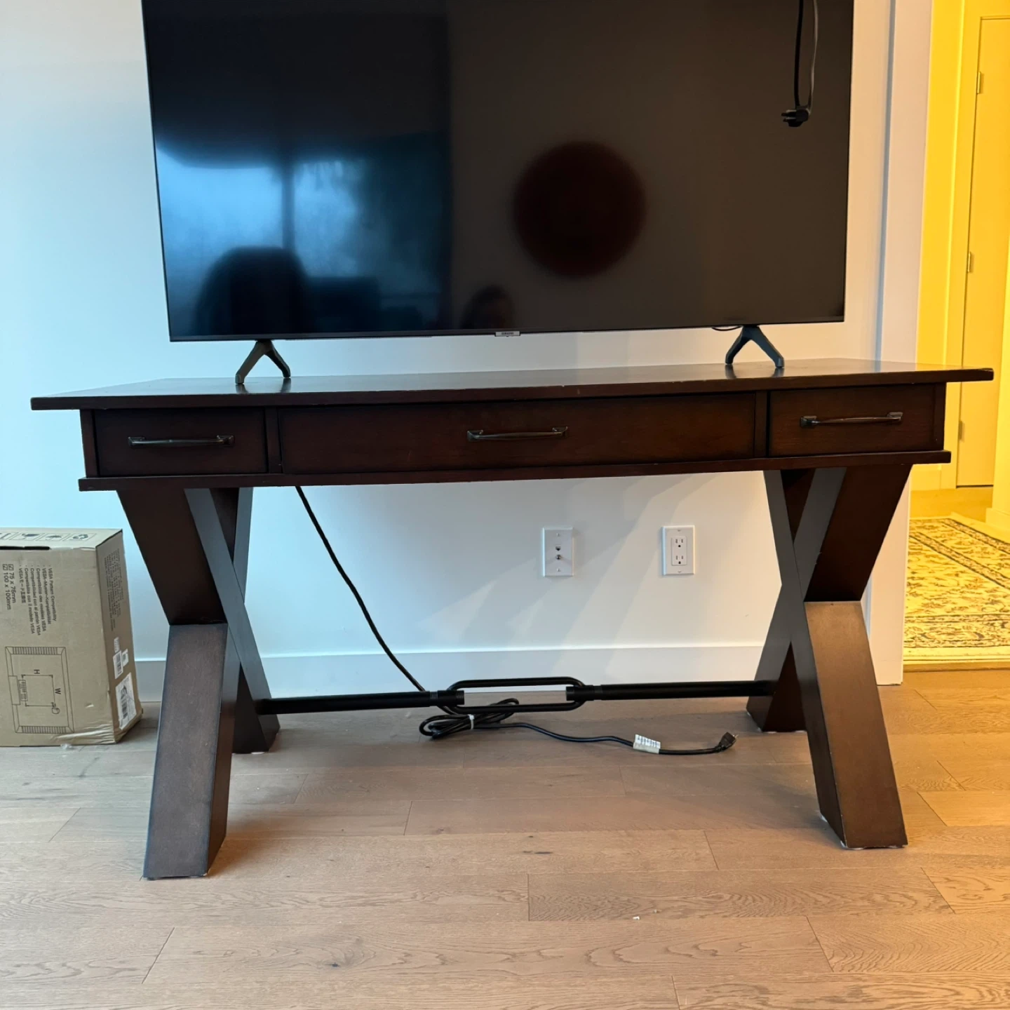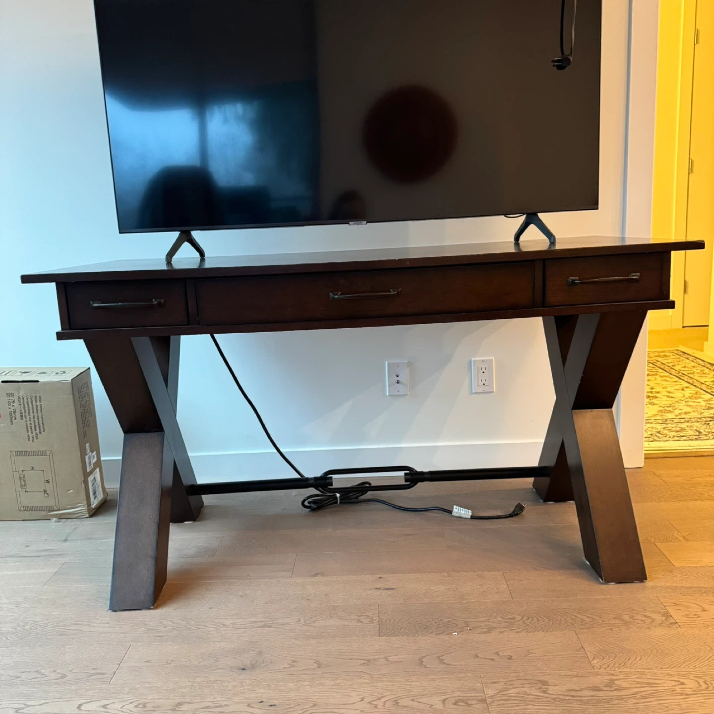This dark wood desk features a stylish X-leg design and three drawers for storage. It includes built-in power outlets and USB ports for convenience. The desk is a great addition for managing electronics and keeping your workspace tidy.