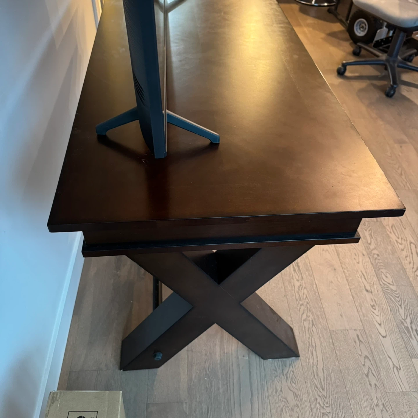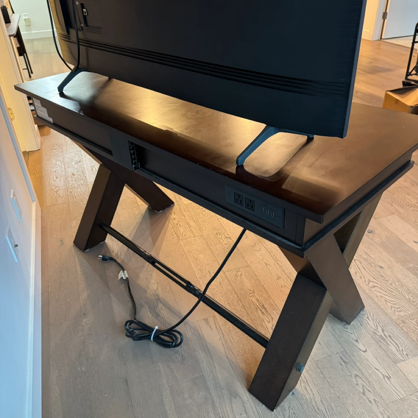 This dark wood desk features a stylish X-leg design and three drawers for storage. It includes built-in power outlets and USB ports for convenience. The desk is a great addition for managing electronics and keeping your workspace tidy.
