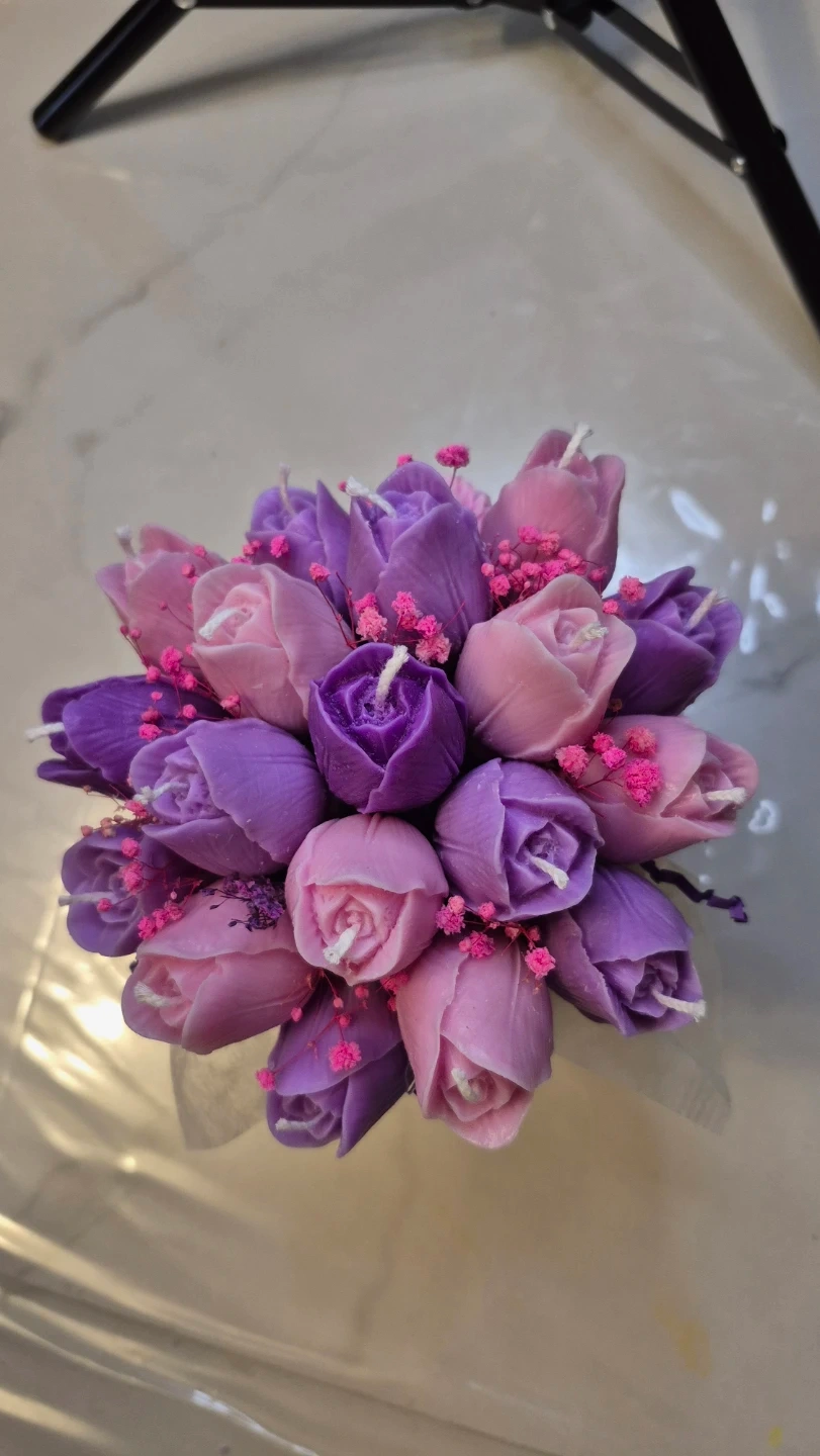 These decorative candles are shaped like beautiful tulip bouquets. They're crafted in lovely shades of pink and purple and include small pink filler flowers. A thoughtful gift for any occasion! Candles are made of natural soy wax. Including 19 candles.