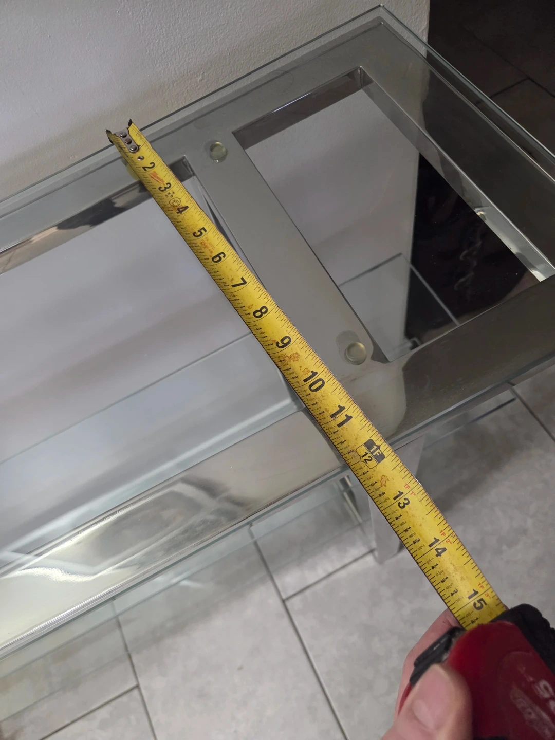 This console table features a clear glass top and shelves with a shiny chrome frame. It's approximately 46 inches long. This table offers a modern look for your entryway or living space.