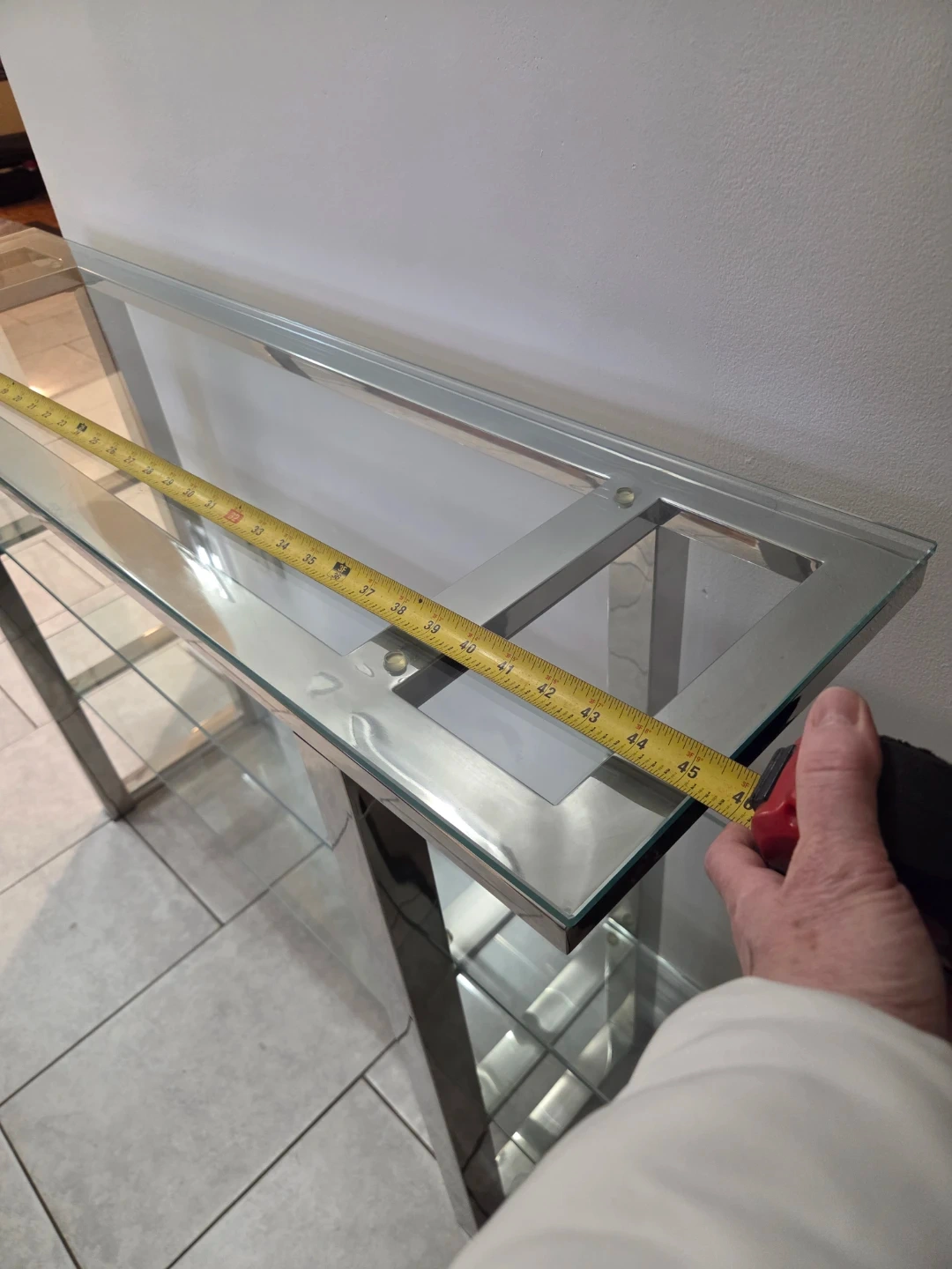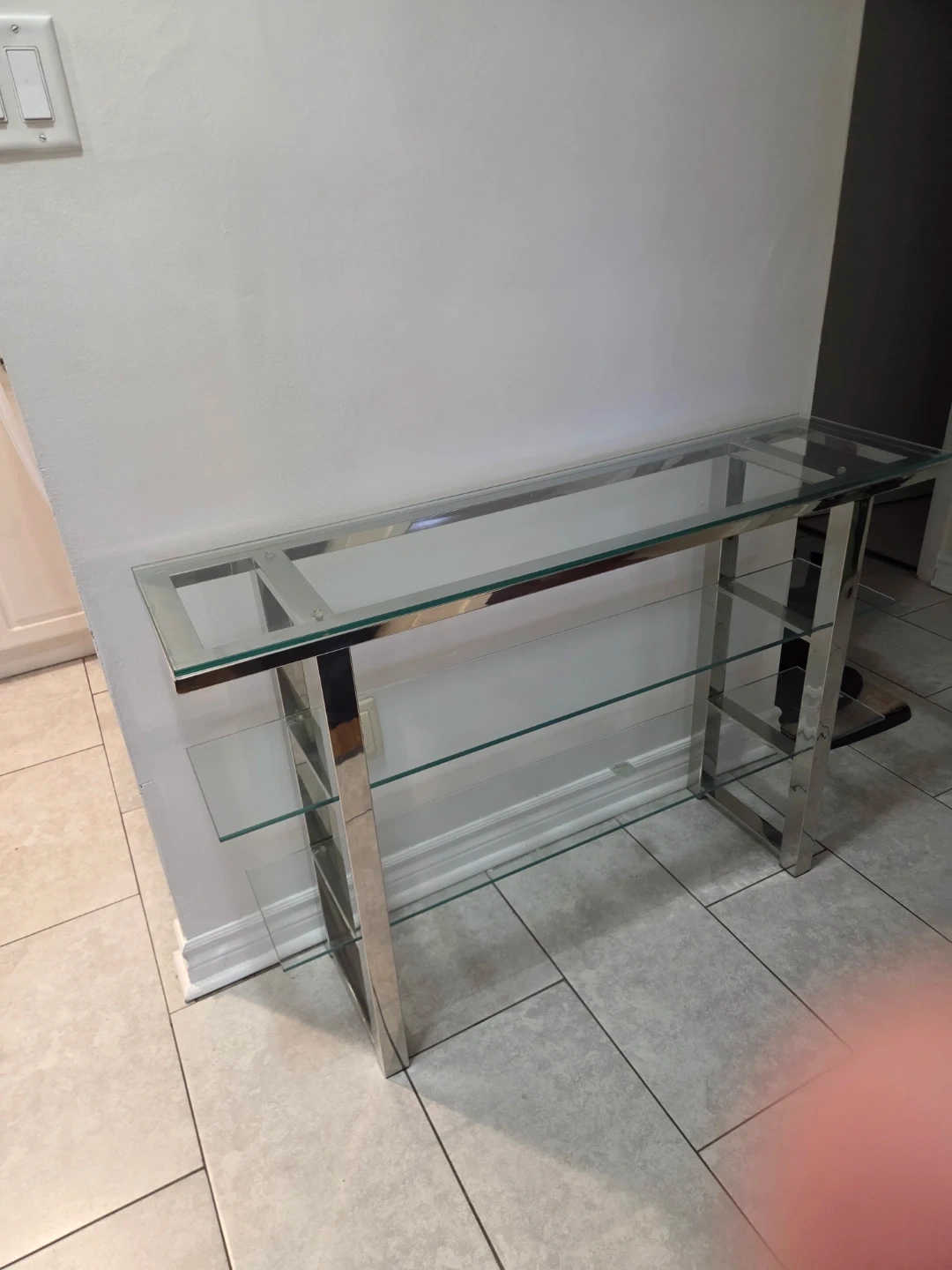 This console table features a clear glass top and shelves with a shiny chrome frame. It's approximately 46 inches long. This table offers a modern look for your entryway or living space.