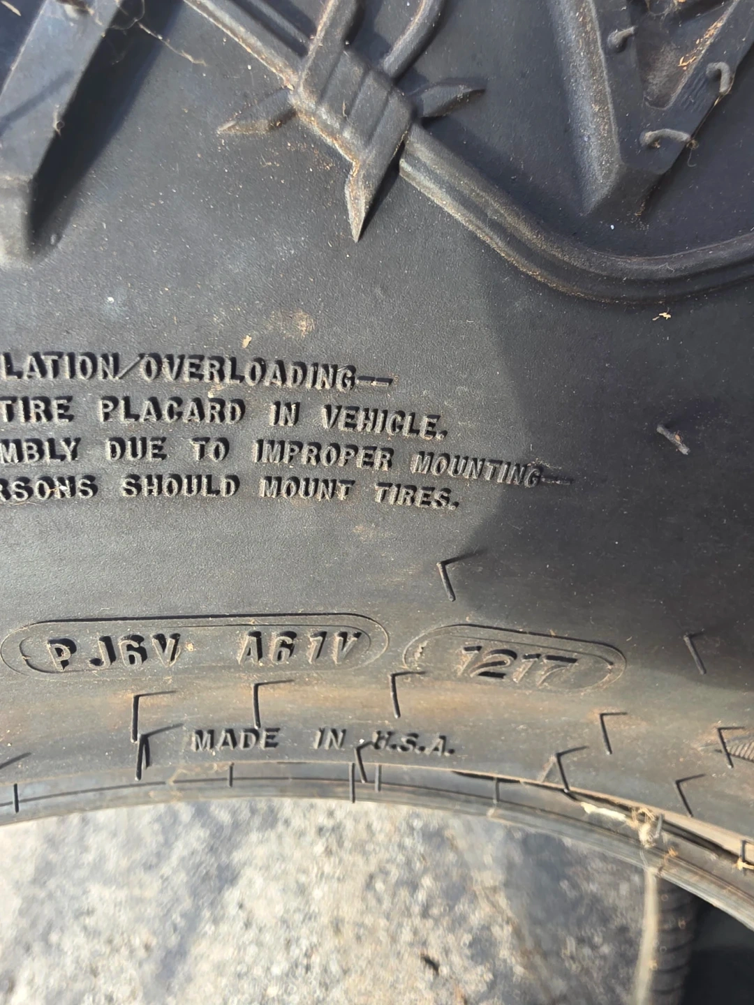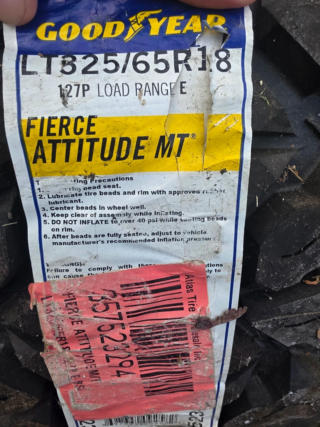 This is a Goodyear Fierce Attitude MT tire. It's a LT325/65R18 size with a load range E. The manufacturing date code is 1217. Only have the 1 tire been stored in my shop since new