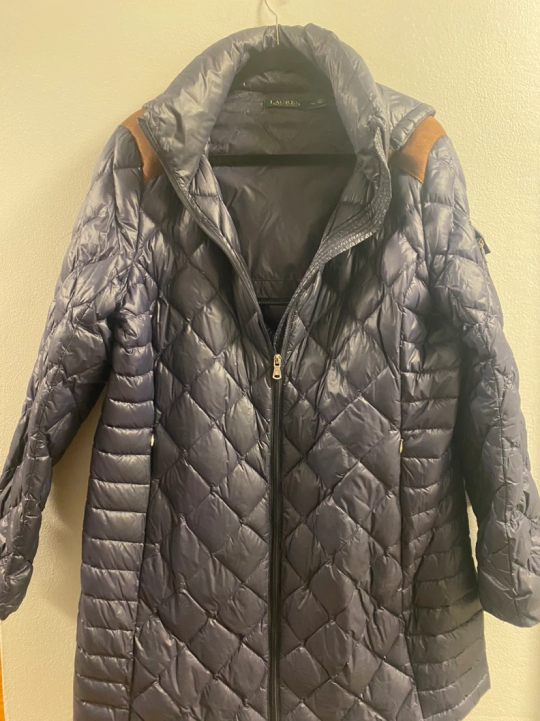 A navy blue quilted puffer jacket with brown faux leather shoulder accents. It features a full zip closure and a hood. The jacket is lightweight and suitable for cooler weather.