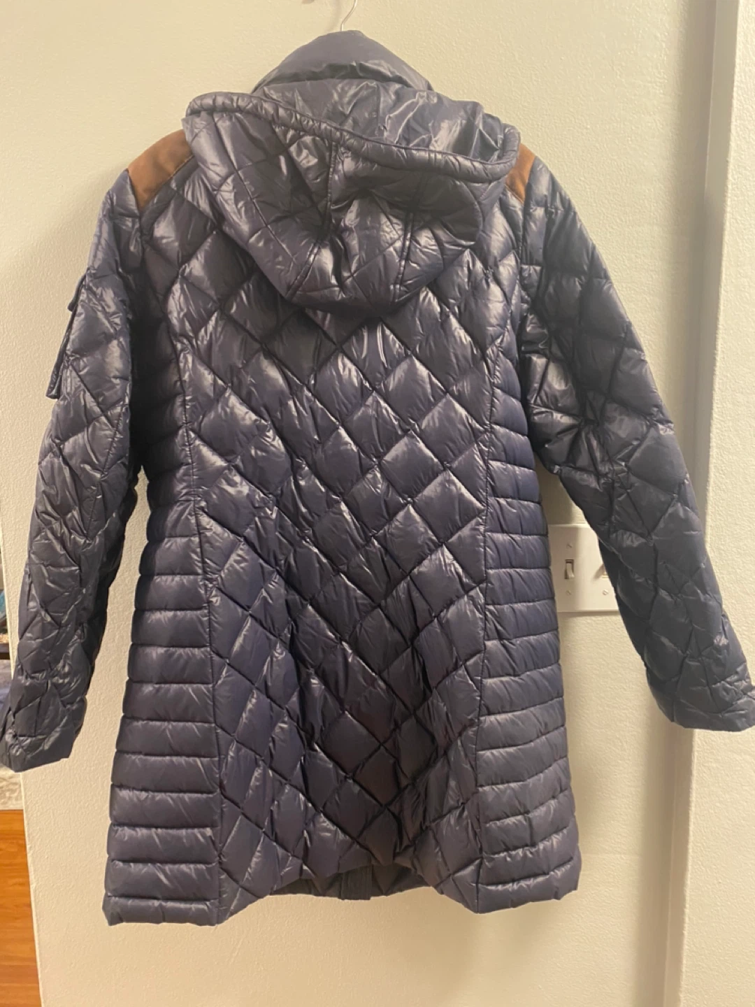 A navy blue quilted puffer jacket with brown faux leather shoulder accents. It features a full zip closure and a hood. The jacket is lightweight and suitable for cooler weather.