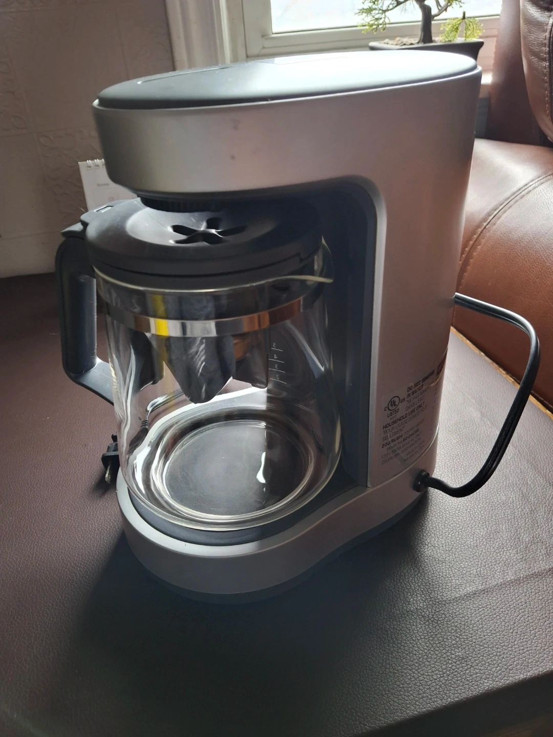 This is a Zojirushi coffee maker with a glass carafe. It has a water level indicator with markings for cups. This drip coffee maker is silver and grey.