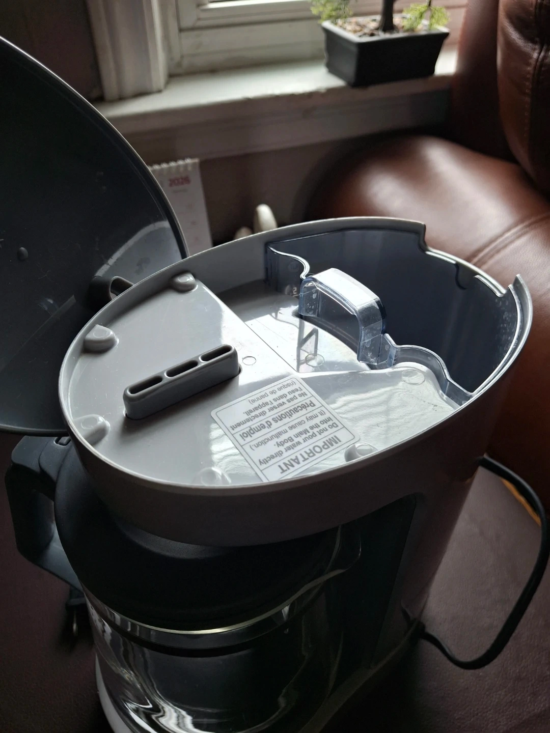 This is a Zojirushi coffee maker with a glass carafe. It has a water level indicator with markings for cups. This drip coffee maker is silver and grey.