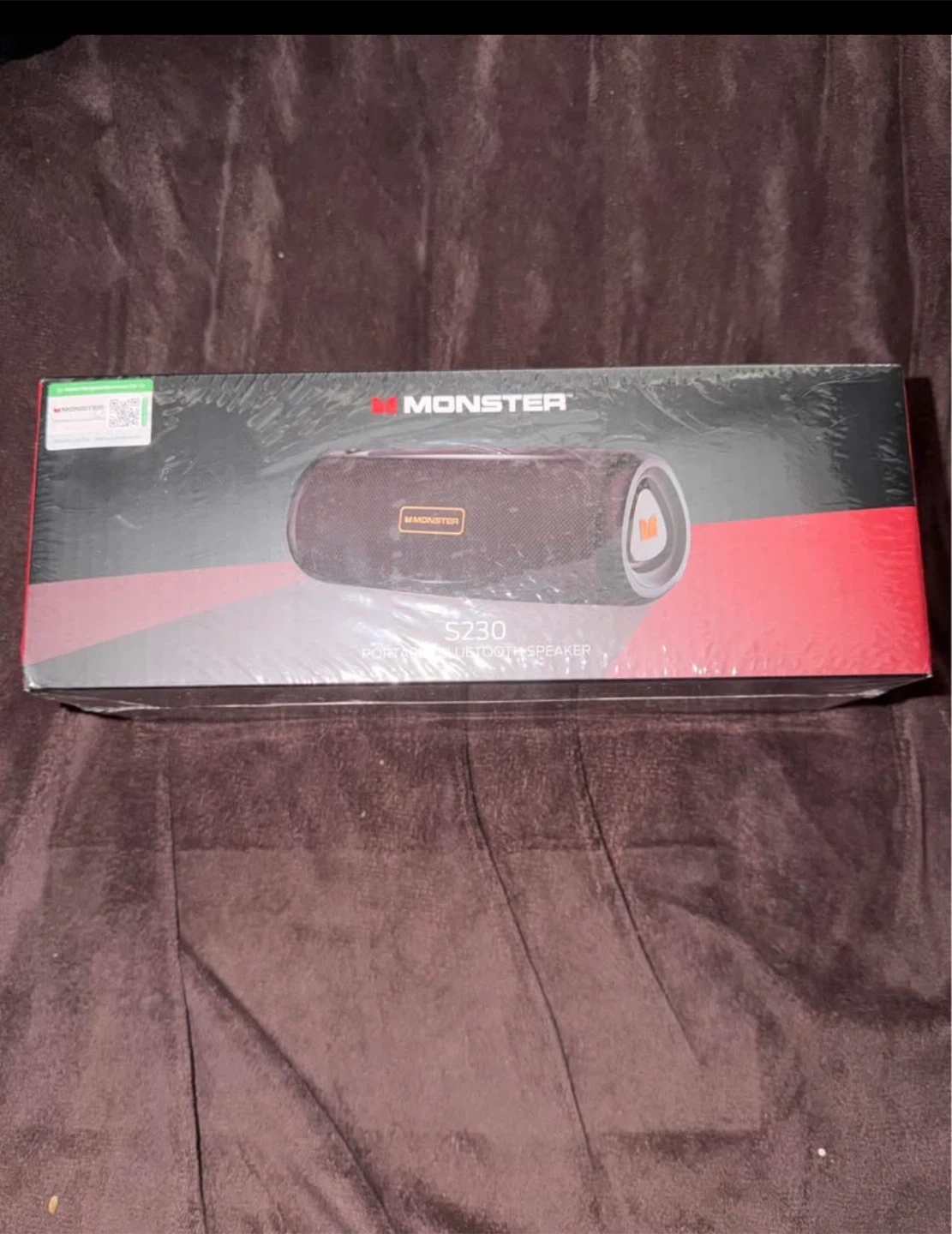 This is a Monster S230 portable Bluetooth speaker. It's great for on-the-go listening. The device is black and features a durable design.