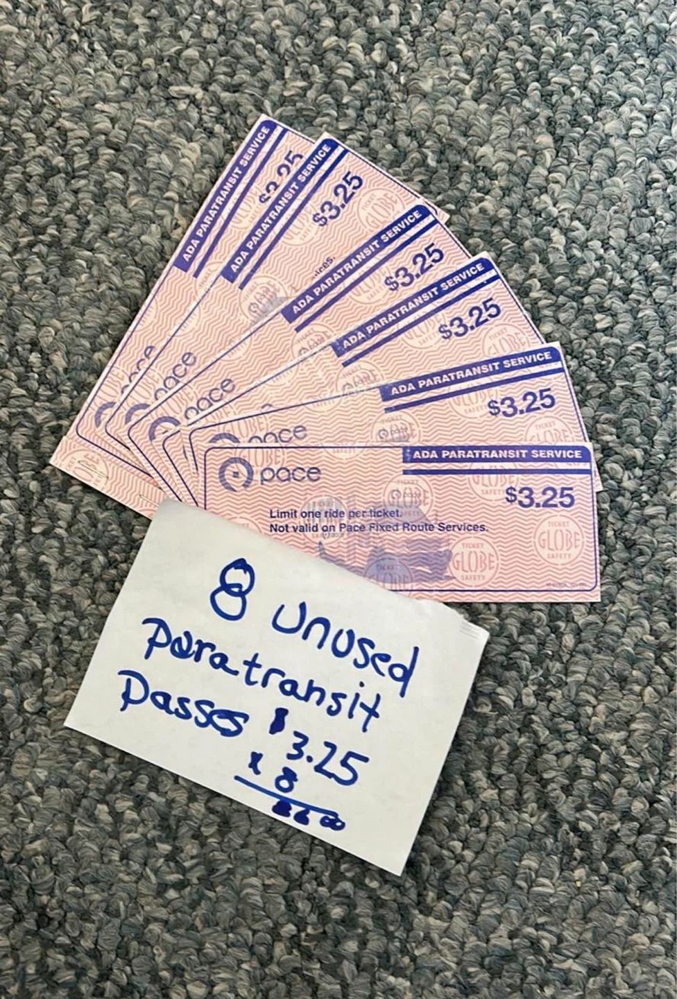 Eight unused Pace ADA Paratransit Service tickets are available. Each ticket is valued at $3.25. Limit one ride per ticket; not valid on Pace Fixed Route Services. (may be additional charges to price rates )