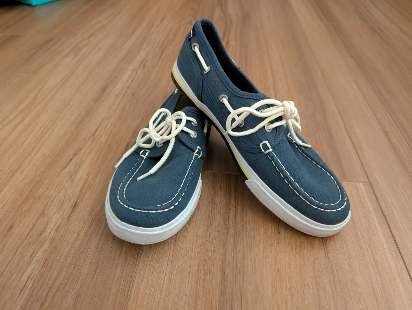 Nautica boat shoes in a deep blue canvas. These shoes feature classic styling with white laces and contrast stitching. They have a durable rubber sole and a comfortable yellow interior.