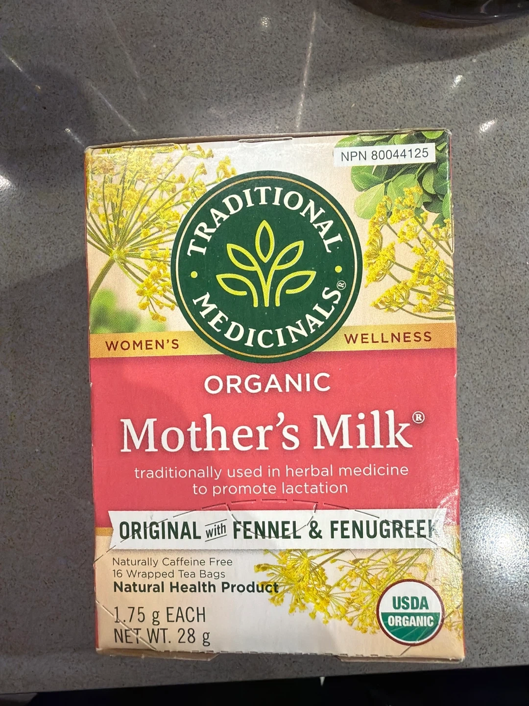 Organic Mother's Milk tea, traditionally used in herbal medicine. It's made with fennel and fenugreek. Naturally caffeine-free, this box contains 16 wrapped tea bags, with each bag at 1.75 g.