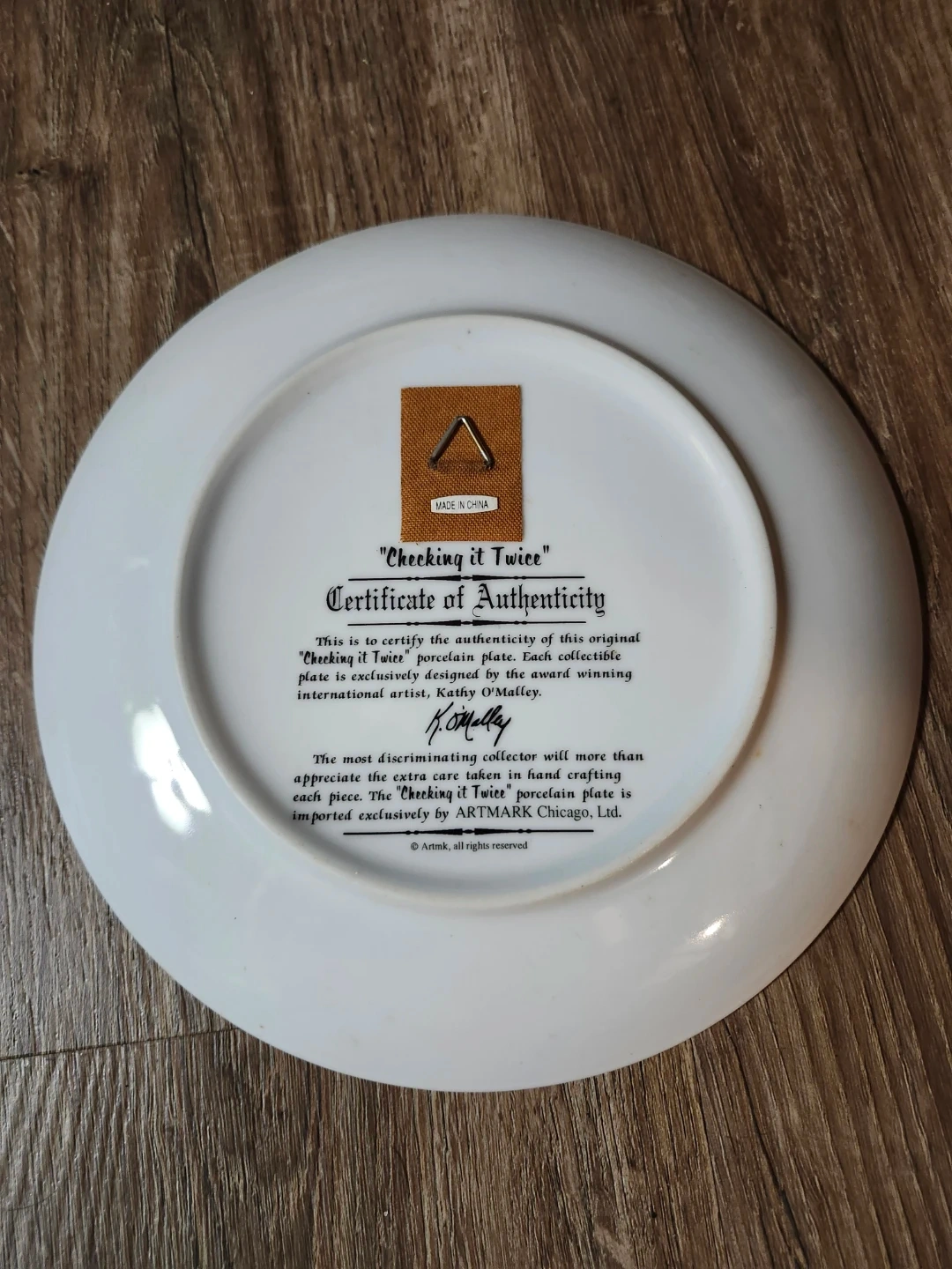 This is the "Checking It Twice" collector plate, exclusively designed by award-winning international artist Kathy O'Malley. The most discriminating collector will more than appreciate the extra care taken in hand crafting each piece. This collectible porcelain plate is imported exclusively by ARTMARK, Chicago, Ltd. It's made in China.