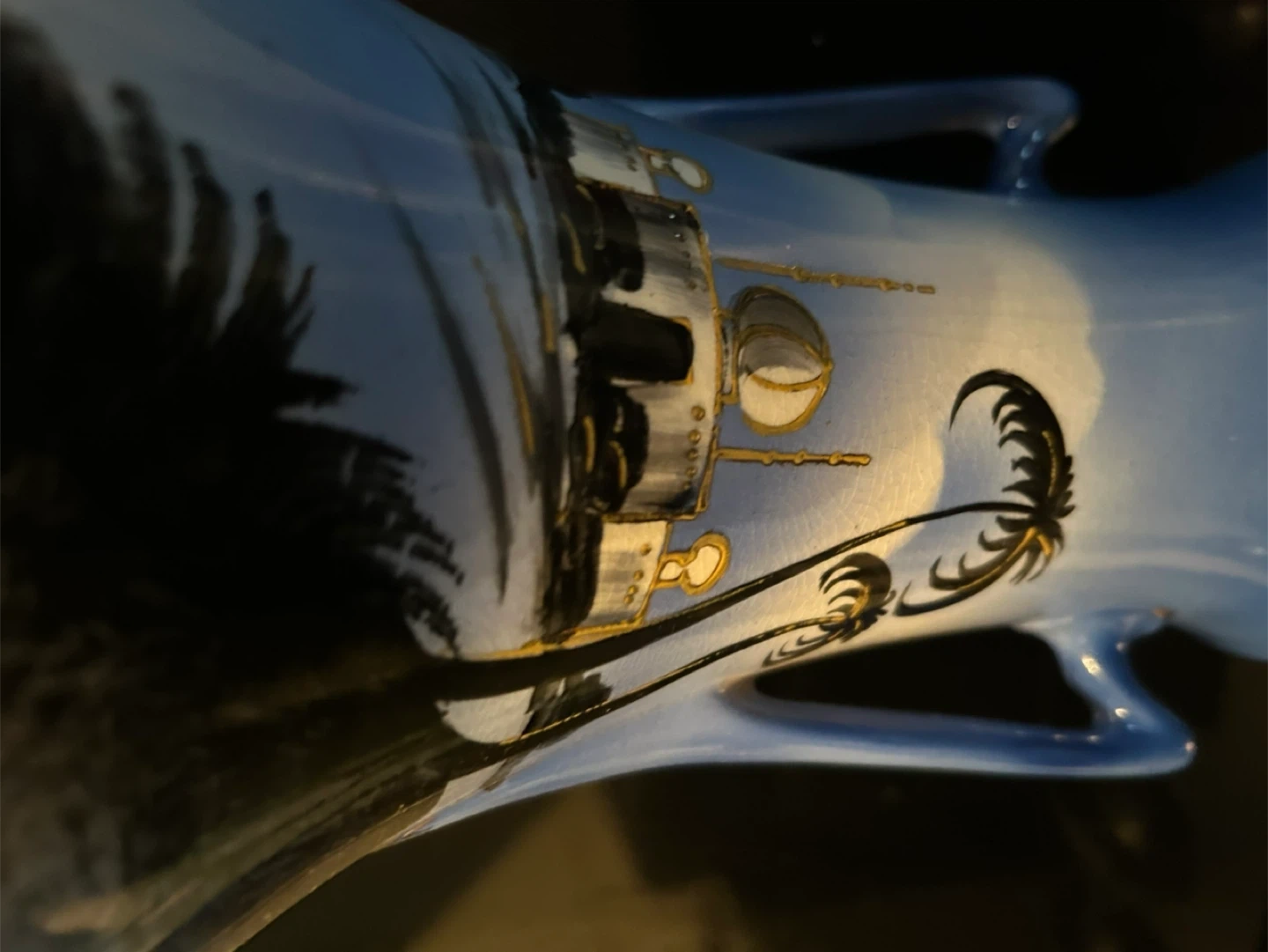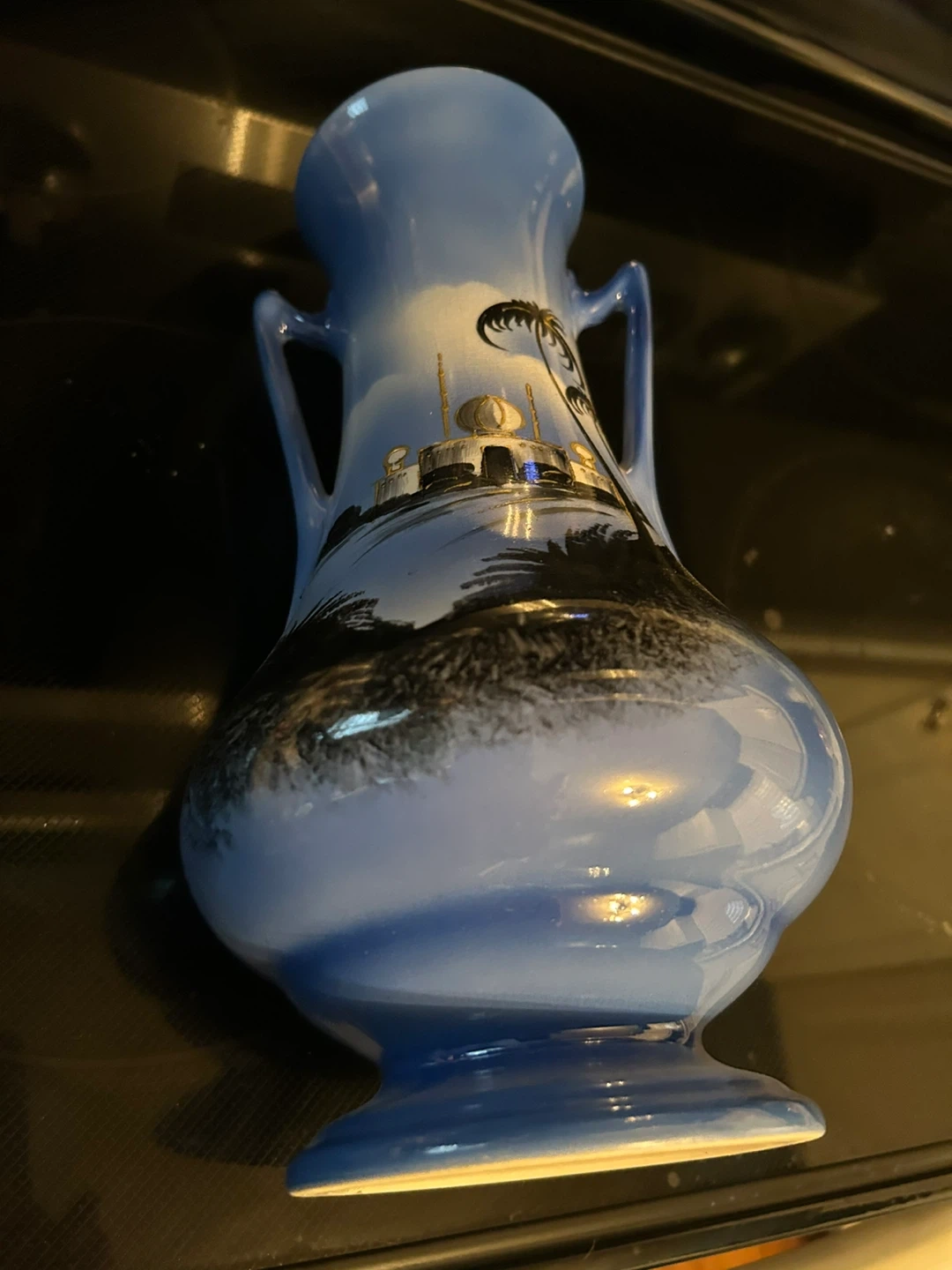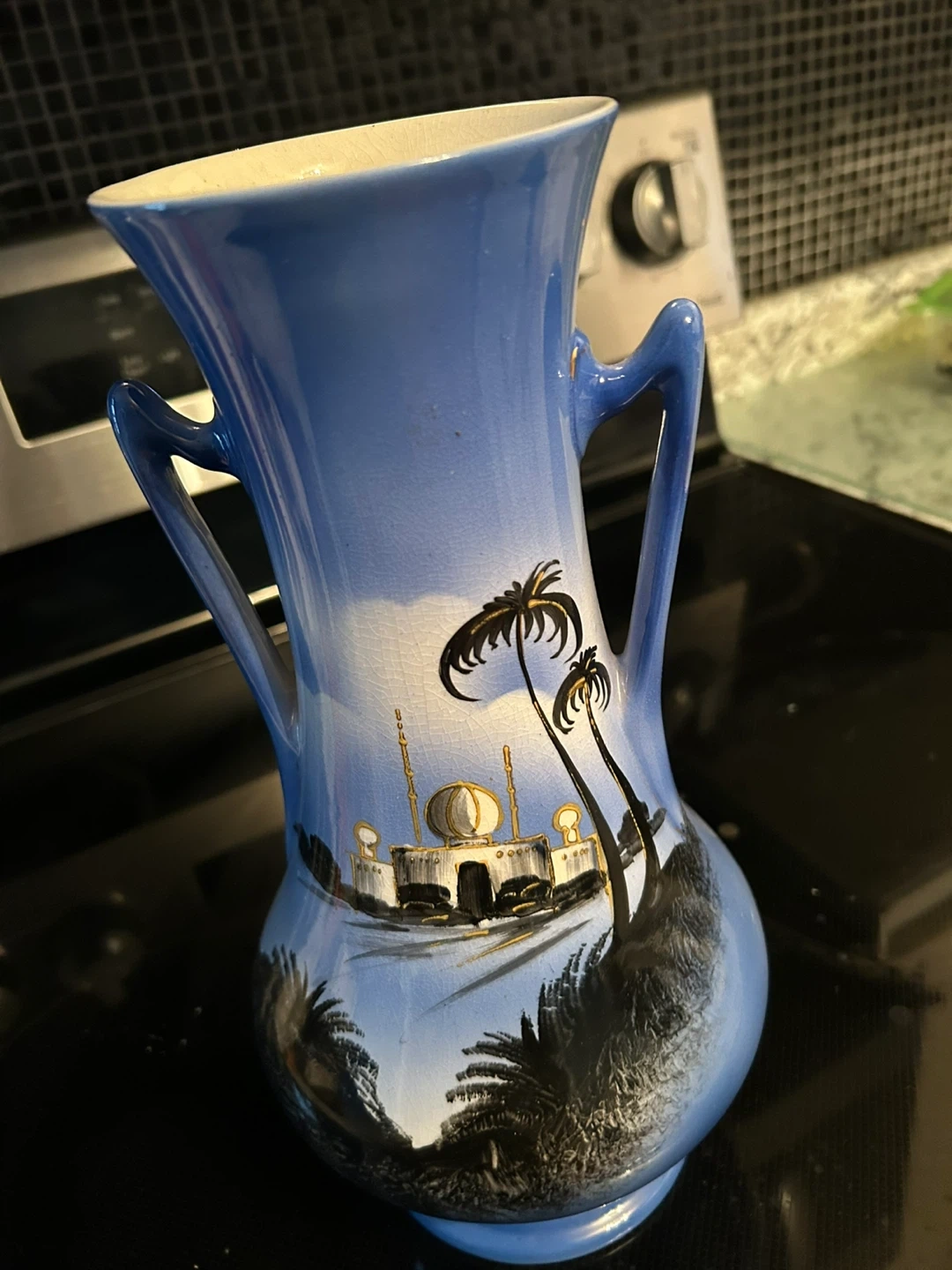 This blue ceramic vase showcases a detailed landscape scene with palm trees and a building. It features two handles on the sides. A lovely decorative piece for any room!