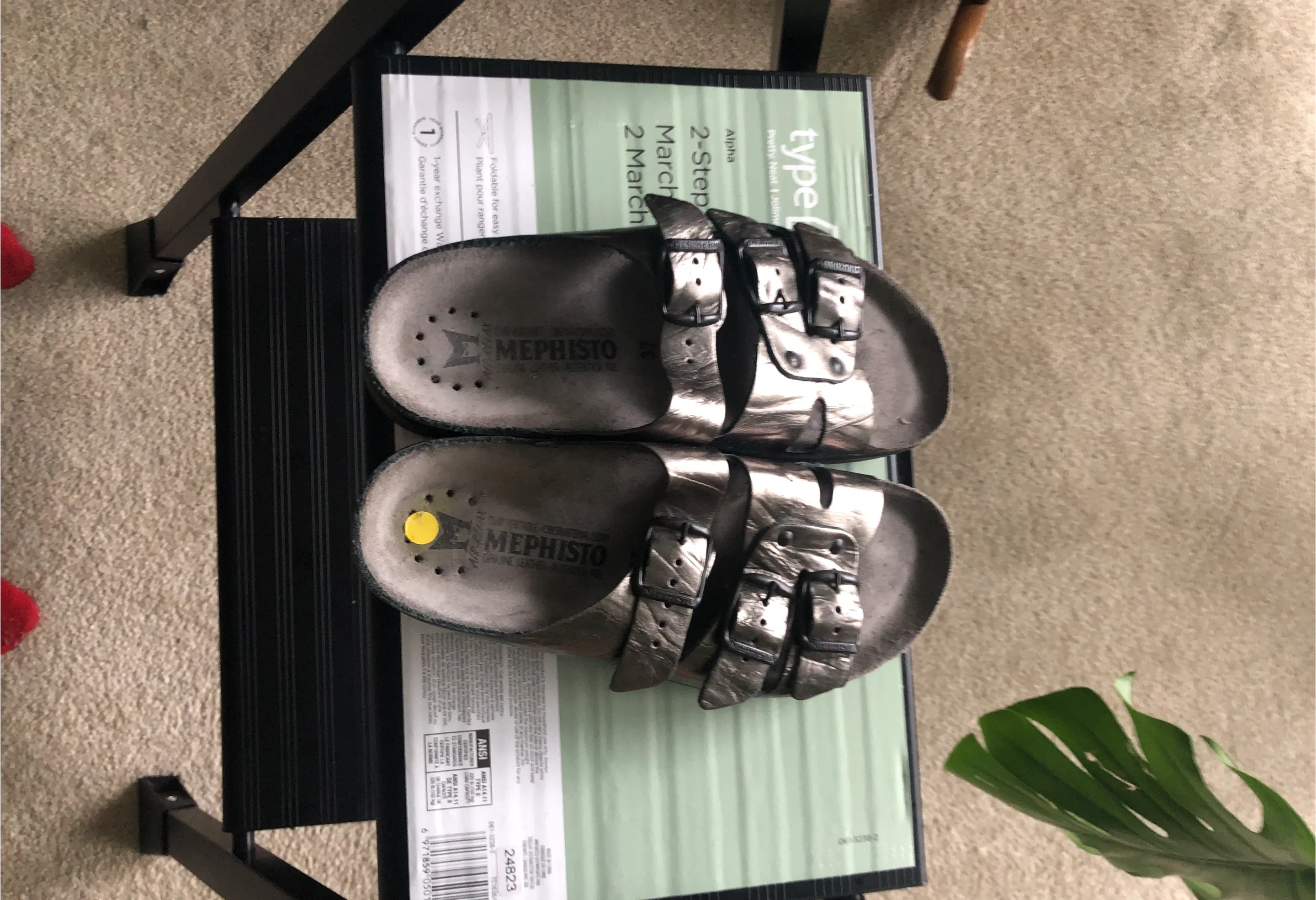 Mephisto sandals in a metallic finish. Genuine leather uppers with adjustable buckles. Features an Air-Relax footbed for comfort.