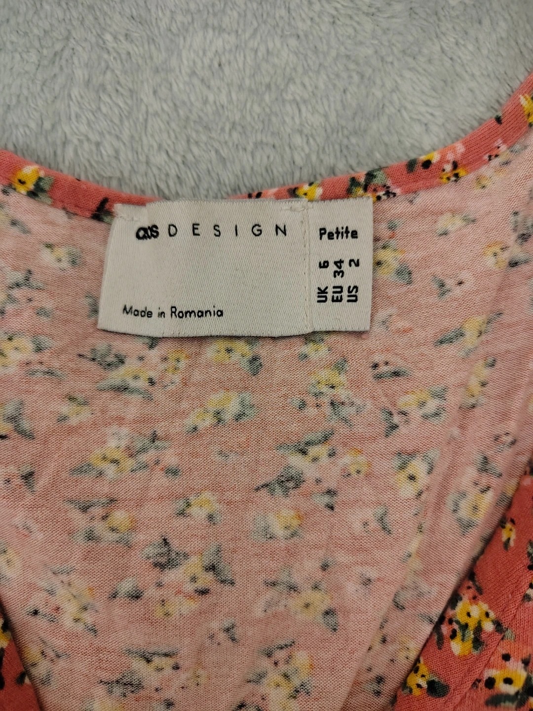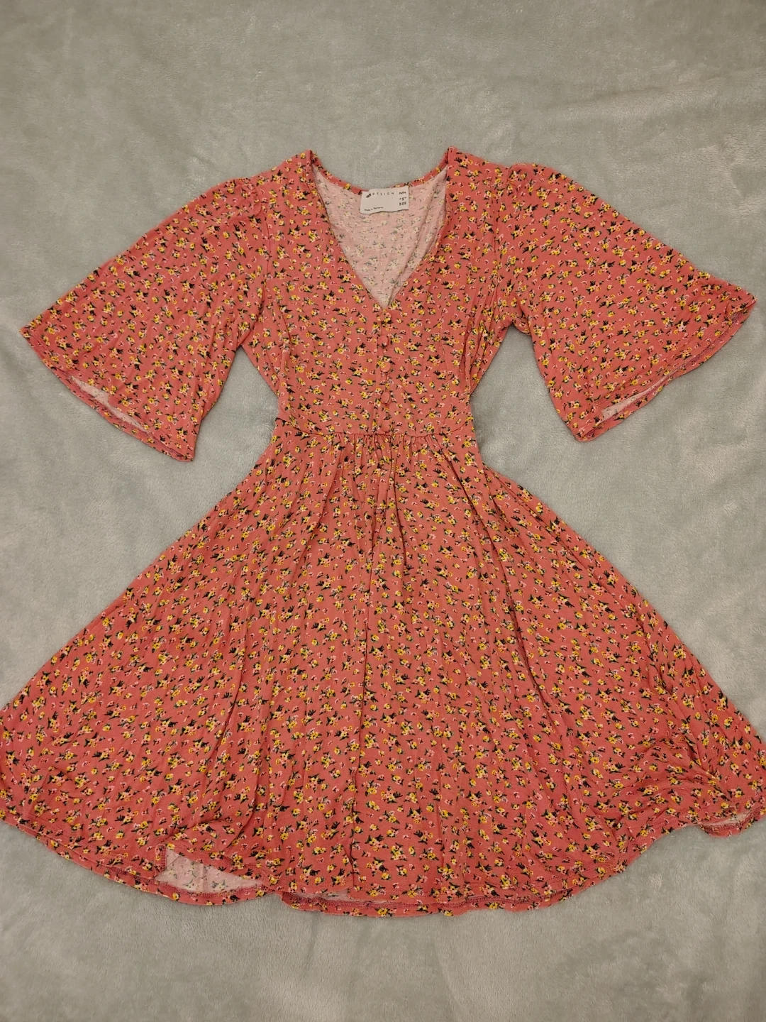 This ASOS DESIGN petite dress features a lovely floral print. It's a midi length with flutter sleeves and a button-down front. Made in Romania, it's a size 2 US.
