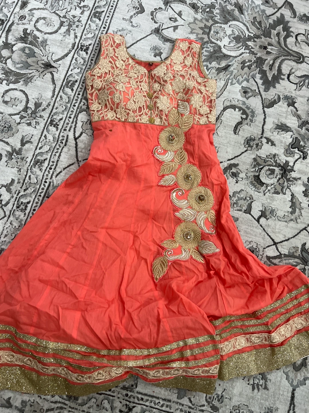 This is an orange sleeveless dress with gold embroidery on the bodice and skirt. It features a floral design and gold trim along the hem. It's a lovely piece for special occasions!