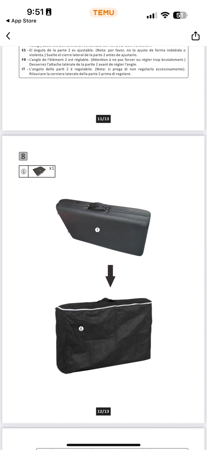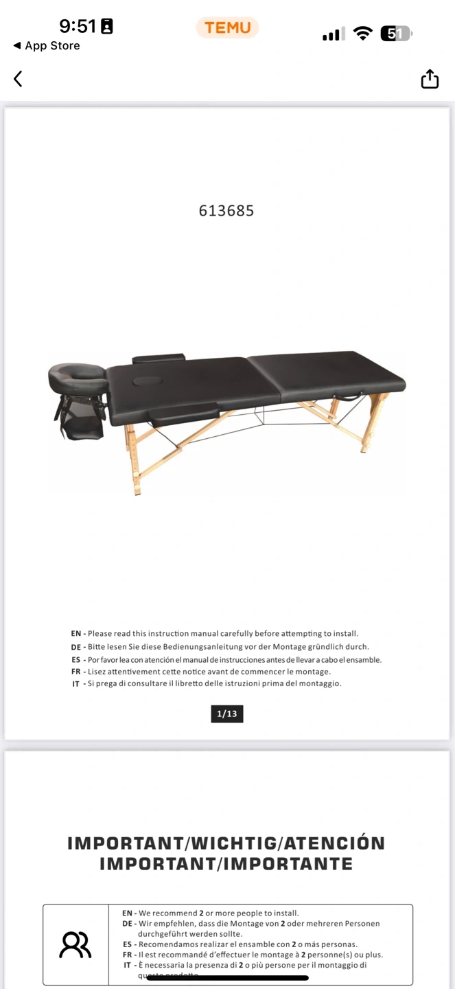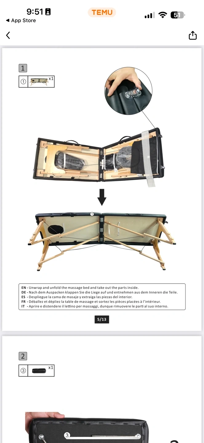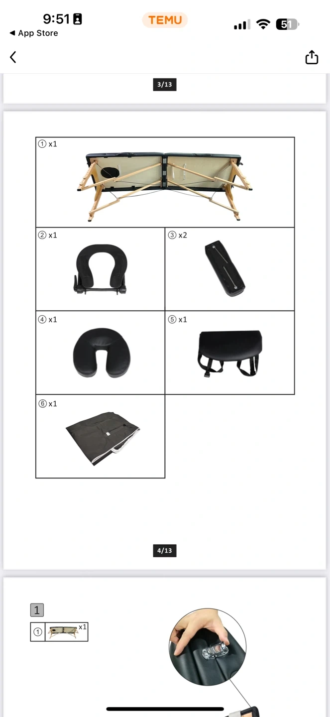 This is a black portable massage table with wooden legs. It's foldable and comes with a headrest, armrests, and a carrying case. Assembly instructions are included.