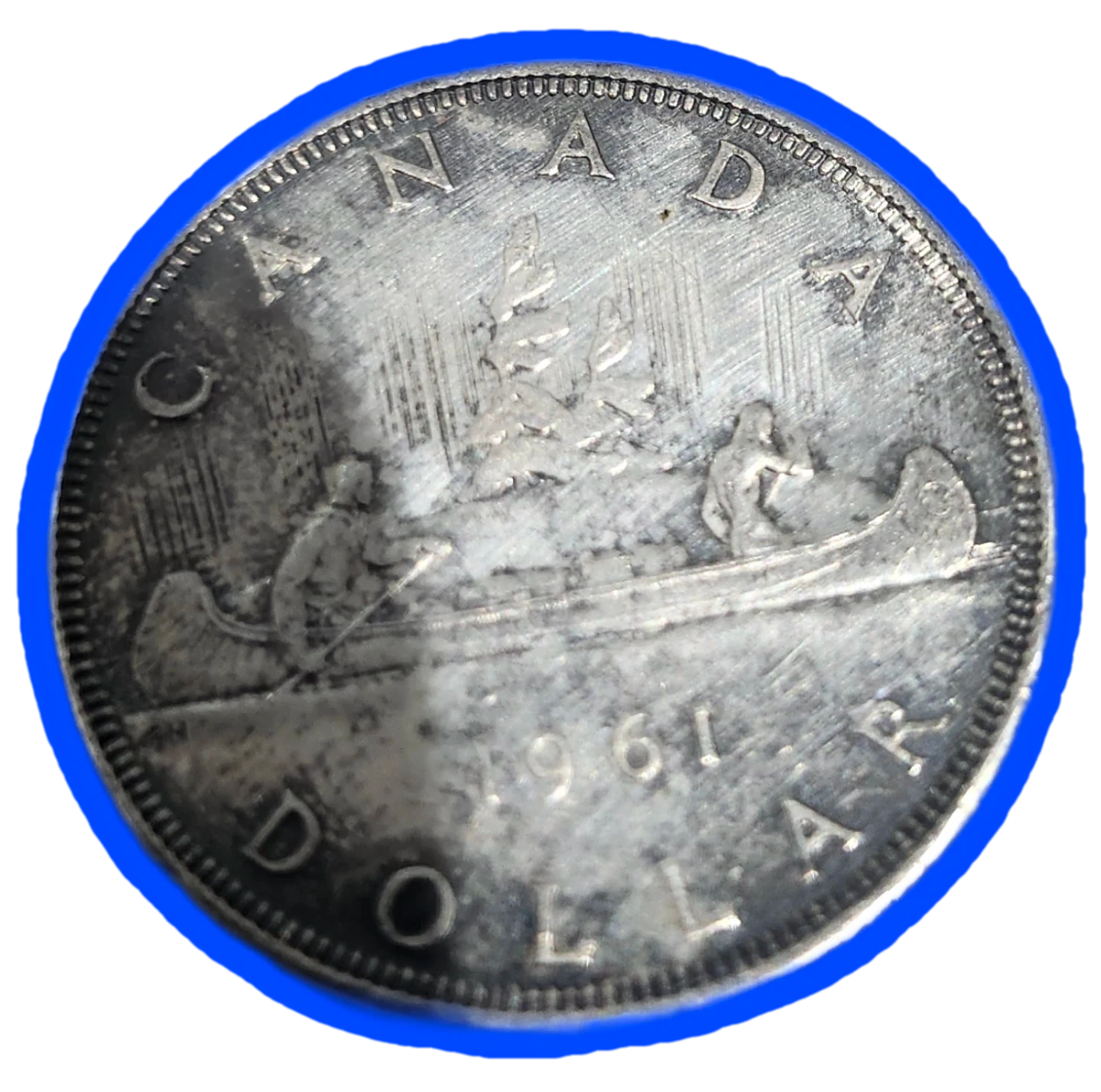That is a 1961Canadian "Voyageur" Silver Dollar. It’s a classic piece of Canadian numismatic history, featuring a voyageur and an Indigenous person paddling a birch-bark canoe.