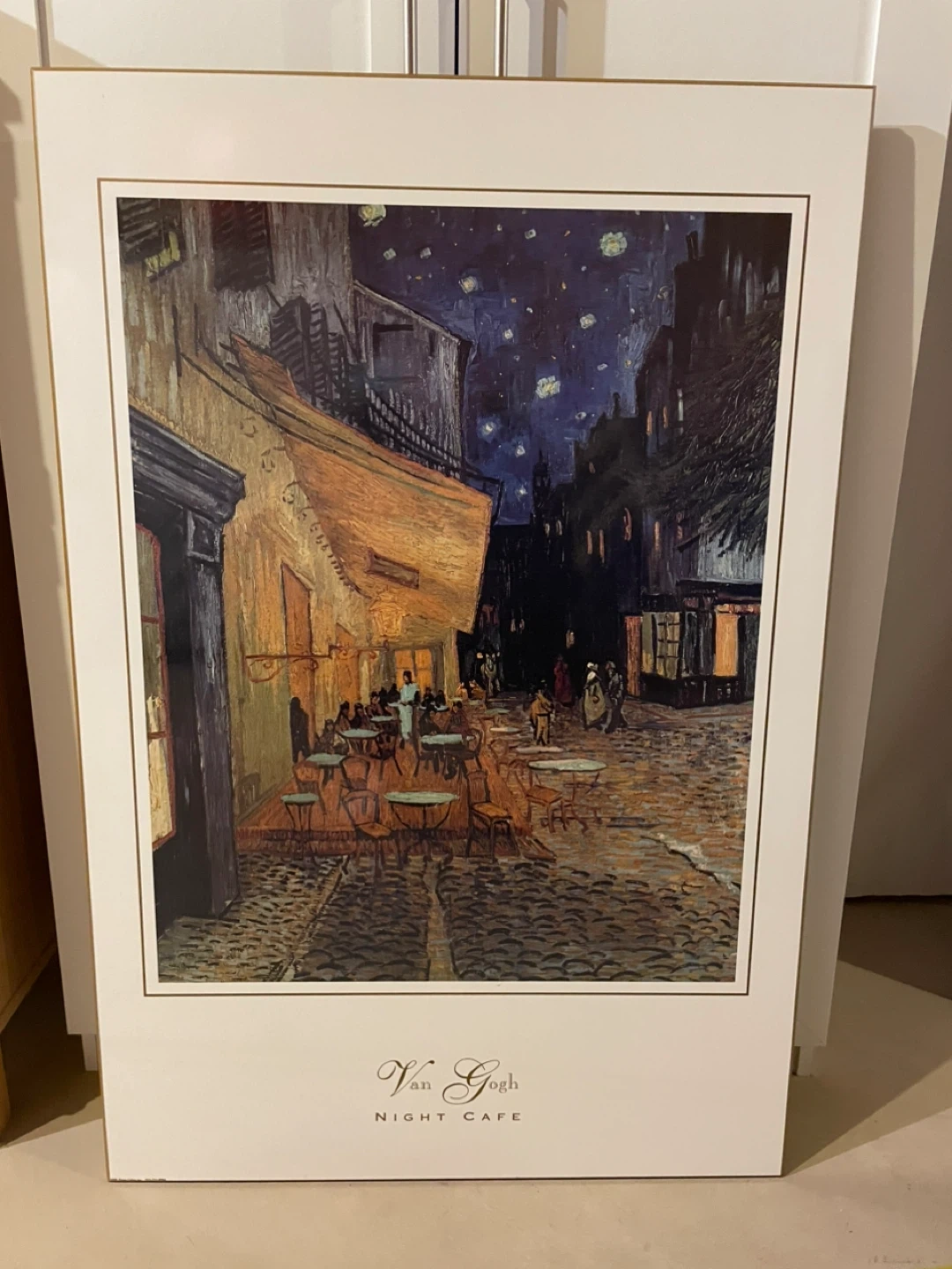 Art plak’d poster of Van Gogh's "Cafe Terrace at Night". Frame is white with gold trim. Dimensions are in the pictures. Great for the any Van Gogh enthusiasts and night time charm.