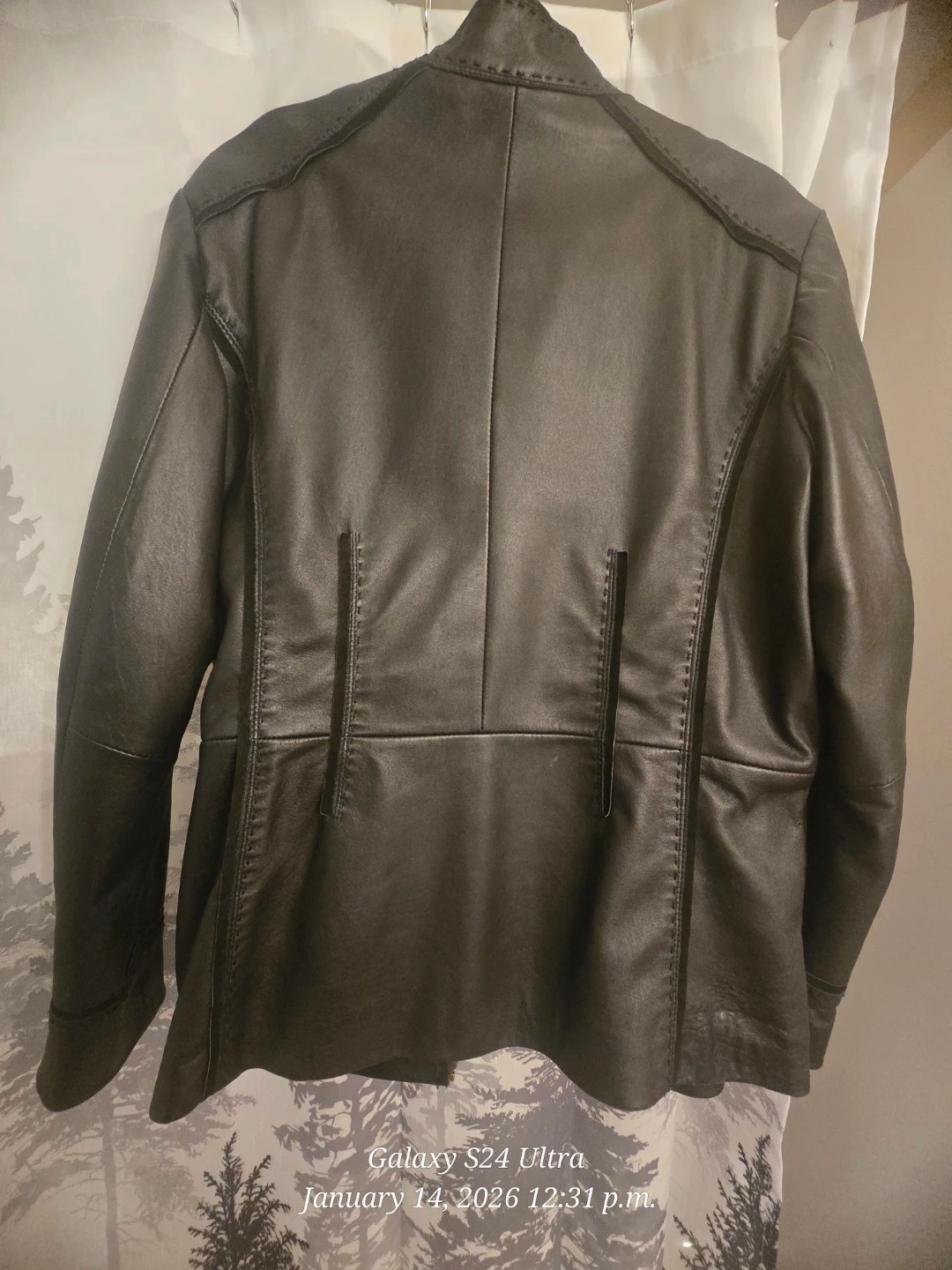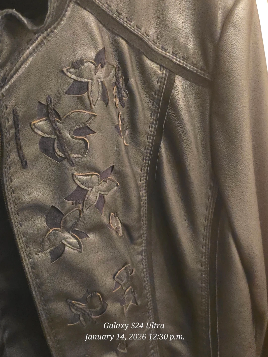 This black leather jacket features delicate floral embroidery along the front. It's a stylish piece with a unique design. Made from genuine leather, it offers a classic look.