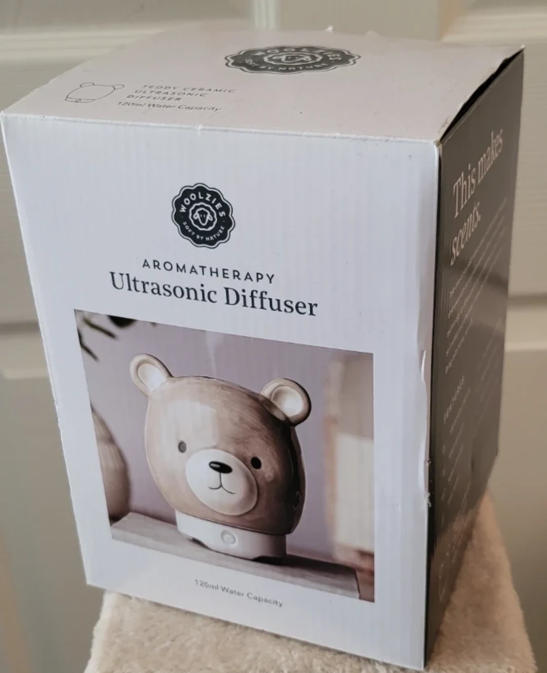 This new Woolzies Teddy Ceramic Ultrasonic Diffuser has a 120ml water capacity and provides silent operation with a safety off switch. It offers multiple light settings and a timer option. This diffuser fills rooms up to 25 meters and runs for 4 hours of continuous mist. It comes with a ceramic shade, diffuser base with cover, adapter, and instructions.