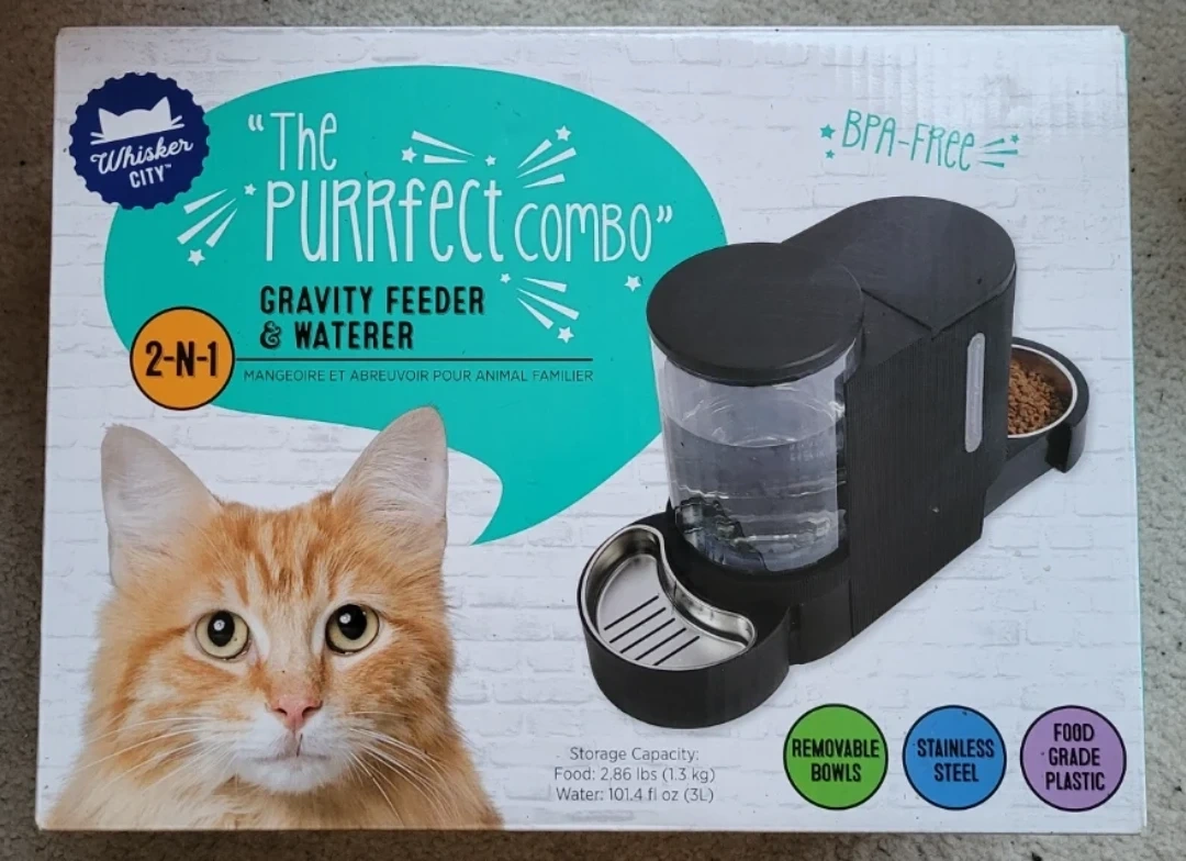 Selling an unopened Whisker City "The Purrfect Combo" 2-in-1 Gravity Feeder & Waterer! This BPA-free feeder has removable stainless steel bowls and a storage capacity of 2.86 lbs (1.3 kg) for food and 101.4 fl oz (3L) for water. It's designed to help your furry friend eat and drink comfortably and automatically replenish food and water as needed. Paid $60.