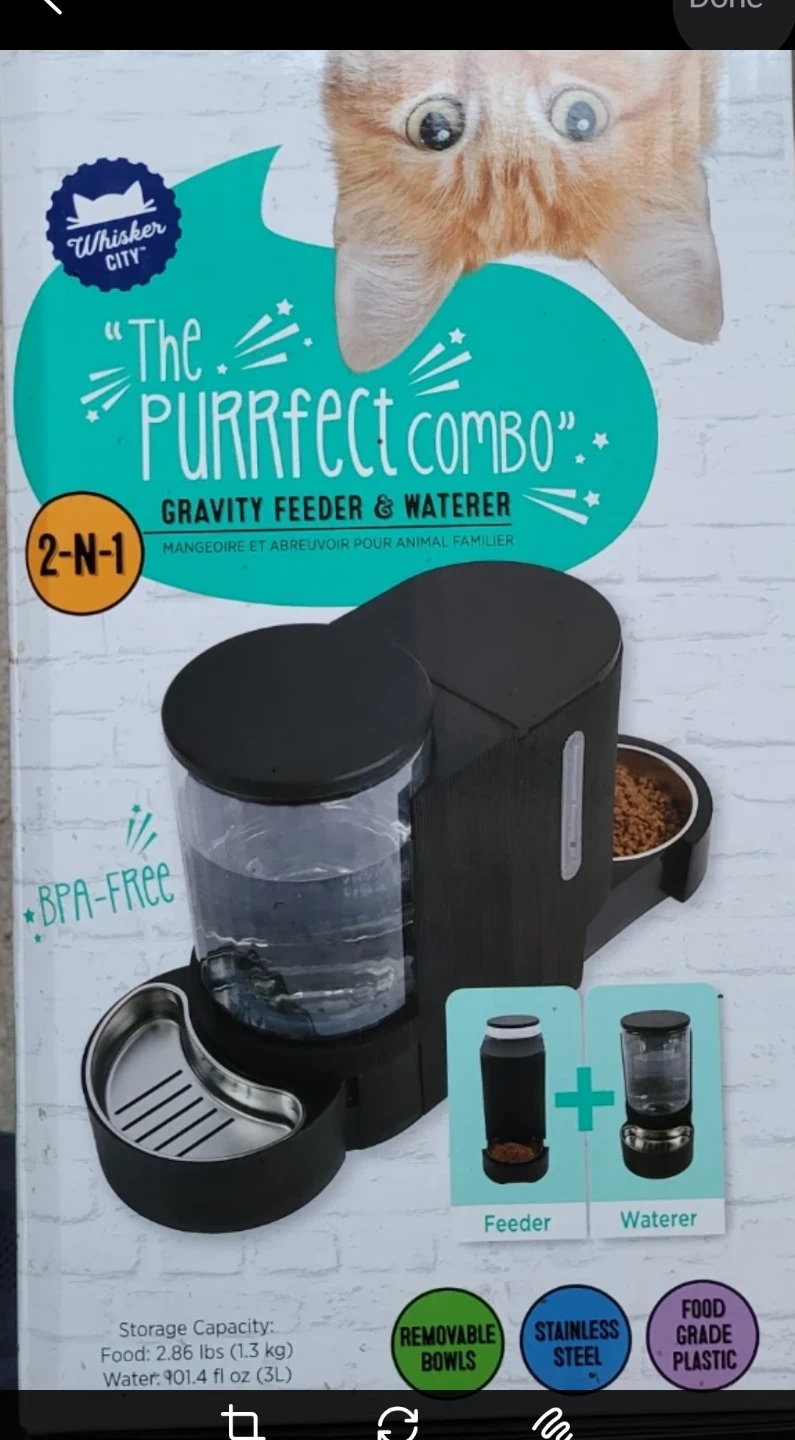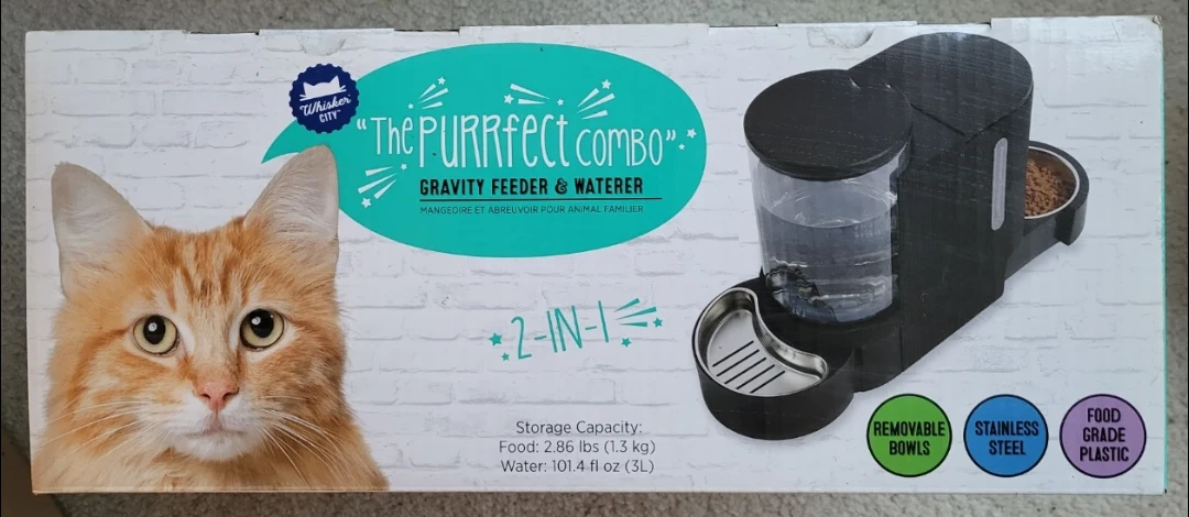 Selling an unopened Whisker City "The Purrfect Combo" 2-in-1 Gravity Feeder & Waterer! This BPA-free feeder has removable stainless steel bowls and a storage capacity of 2.86 lbs (1.3 kg) for food and 101.4 fl oz (3L) for water. It's designed to help your furry friend eat and drink comfortably and automatically replenish food and water as needed. Paid $60.