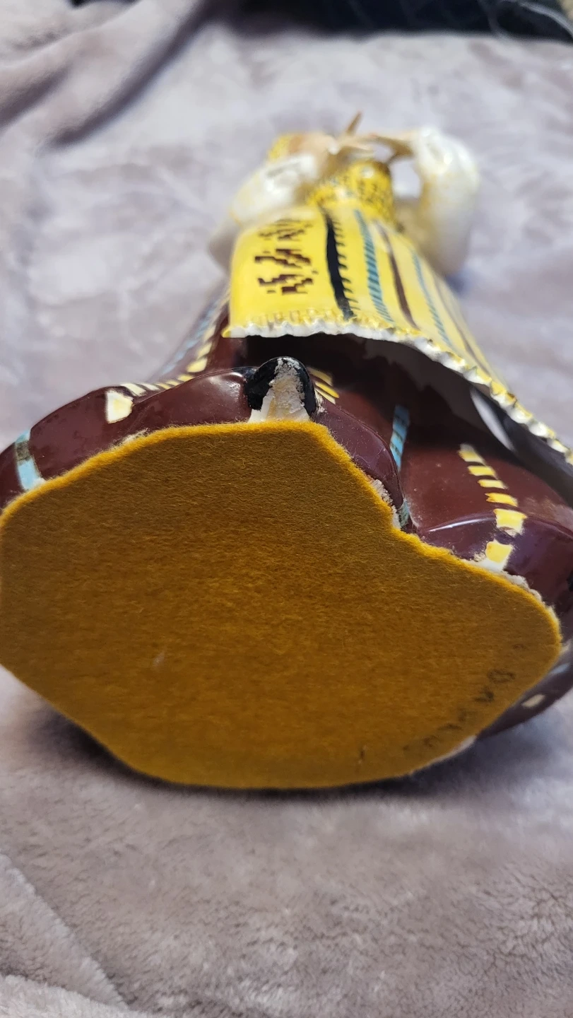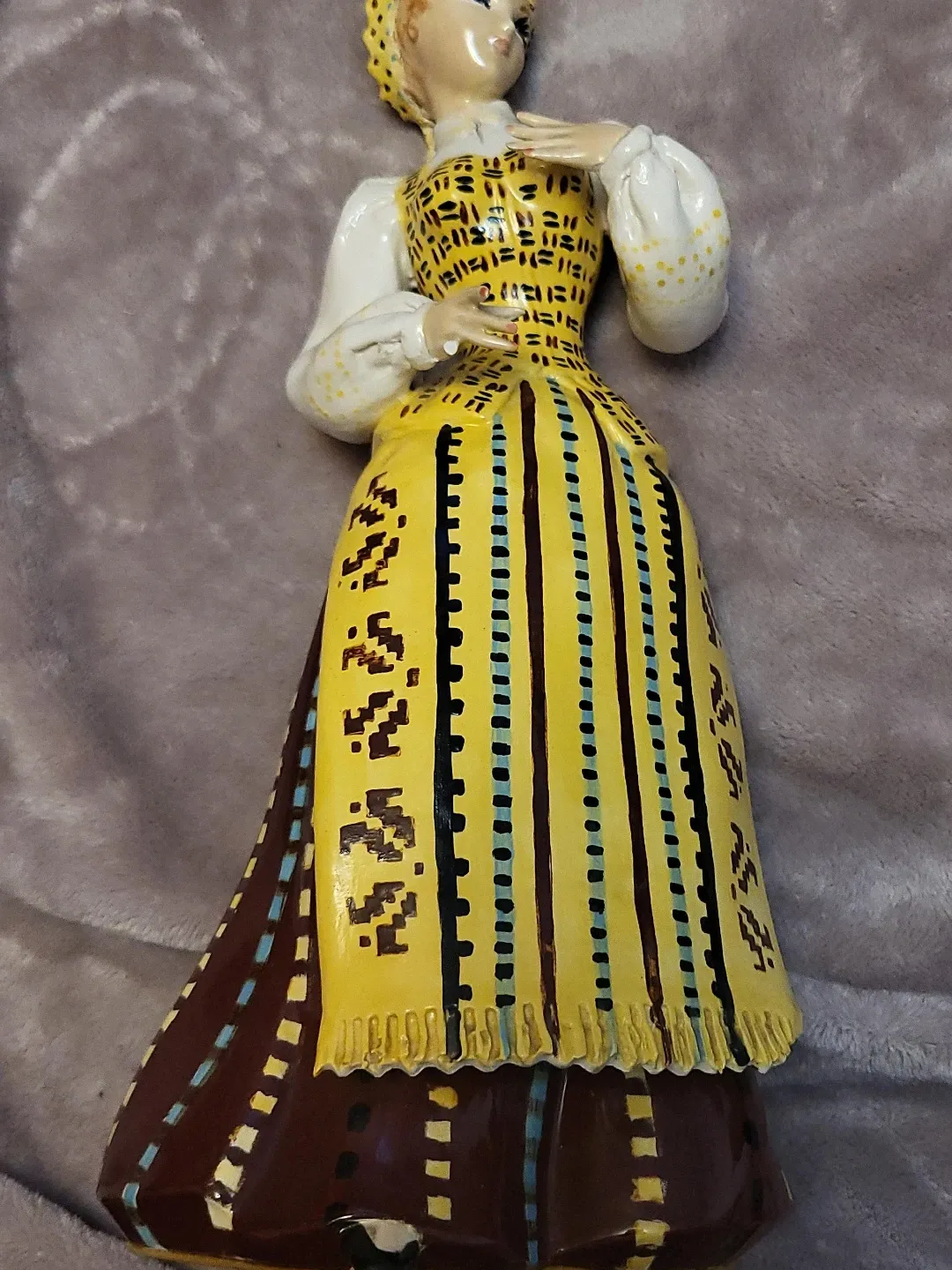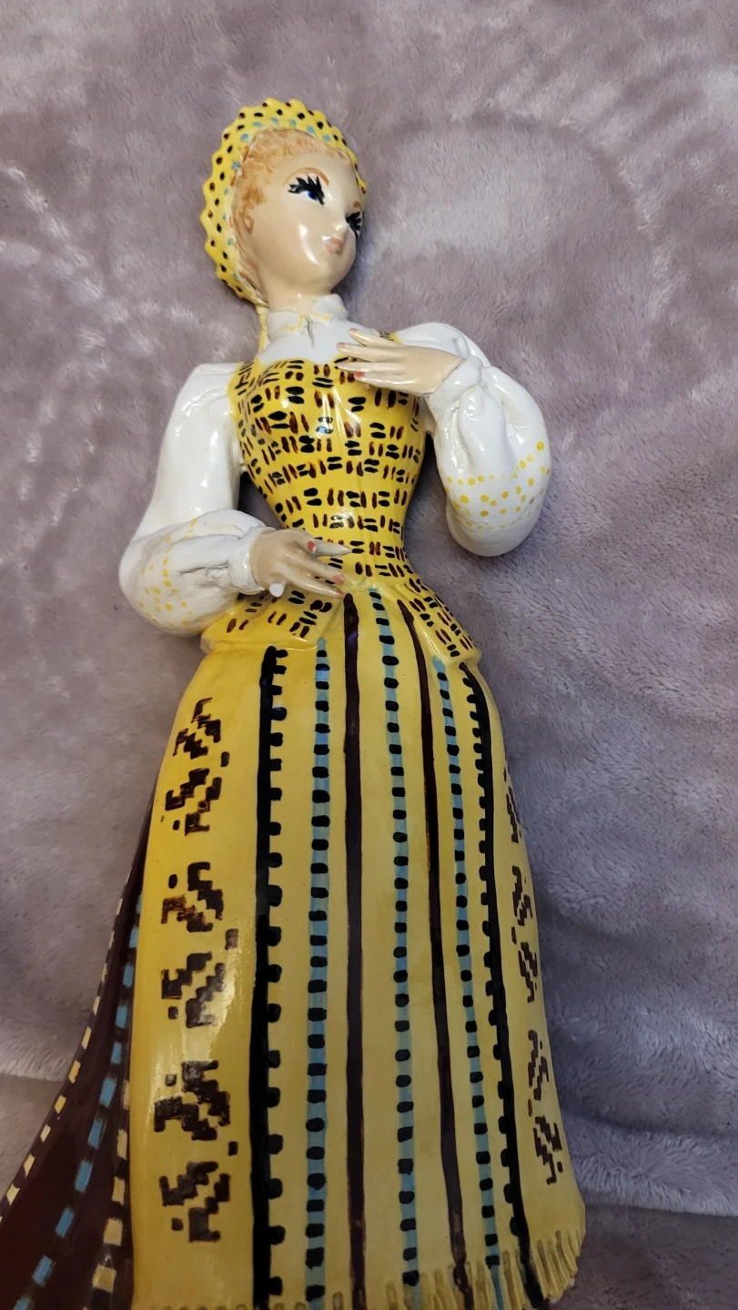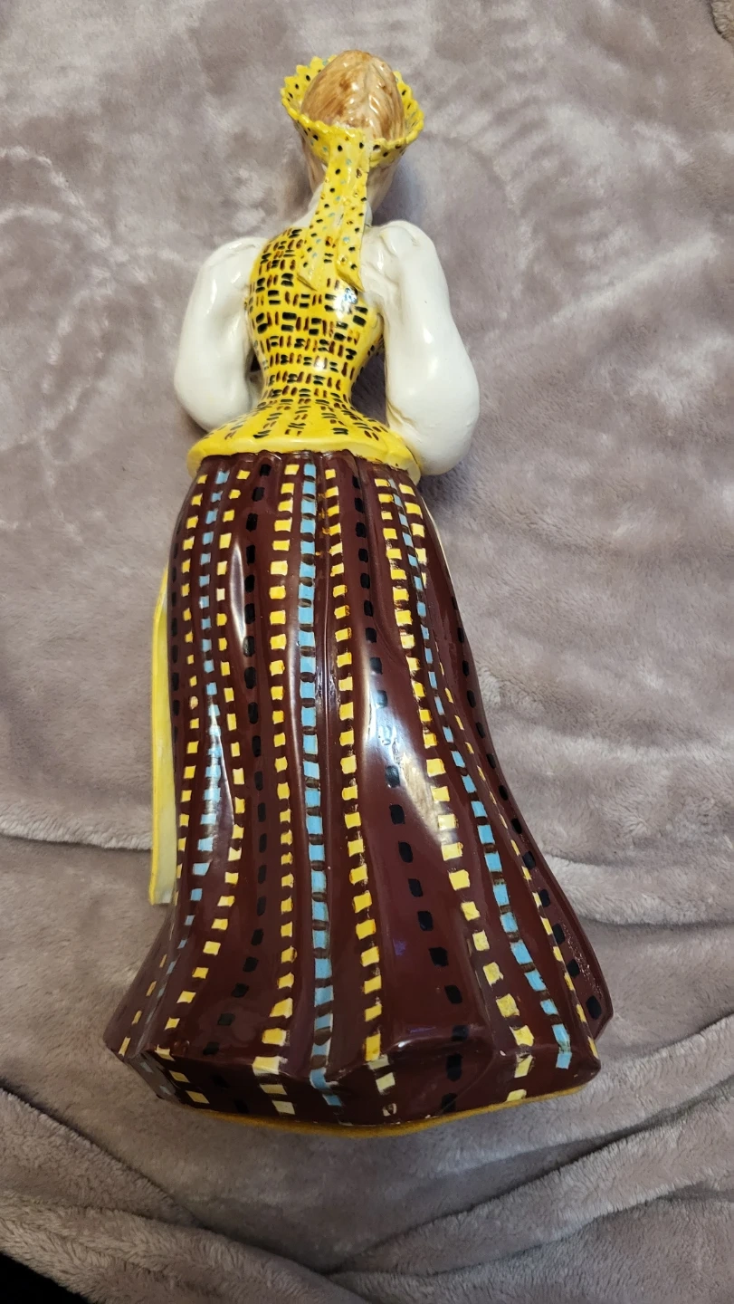 Selling a vintage ceramic european figurine of a woman. It has a unique design with yellow, brown, and blue accents. It's a little more then a foot tall