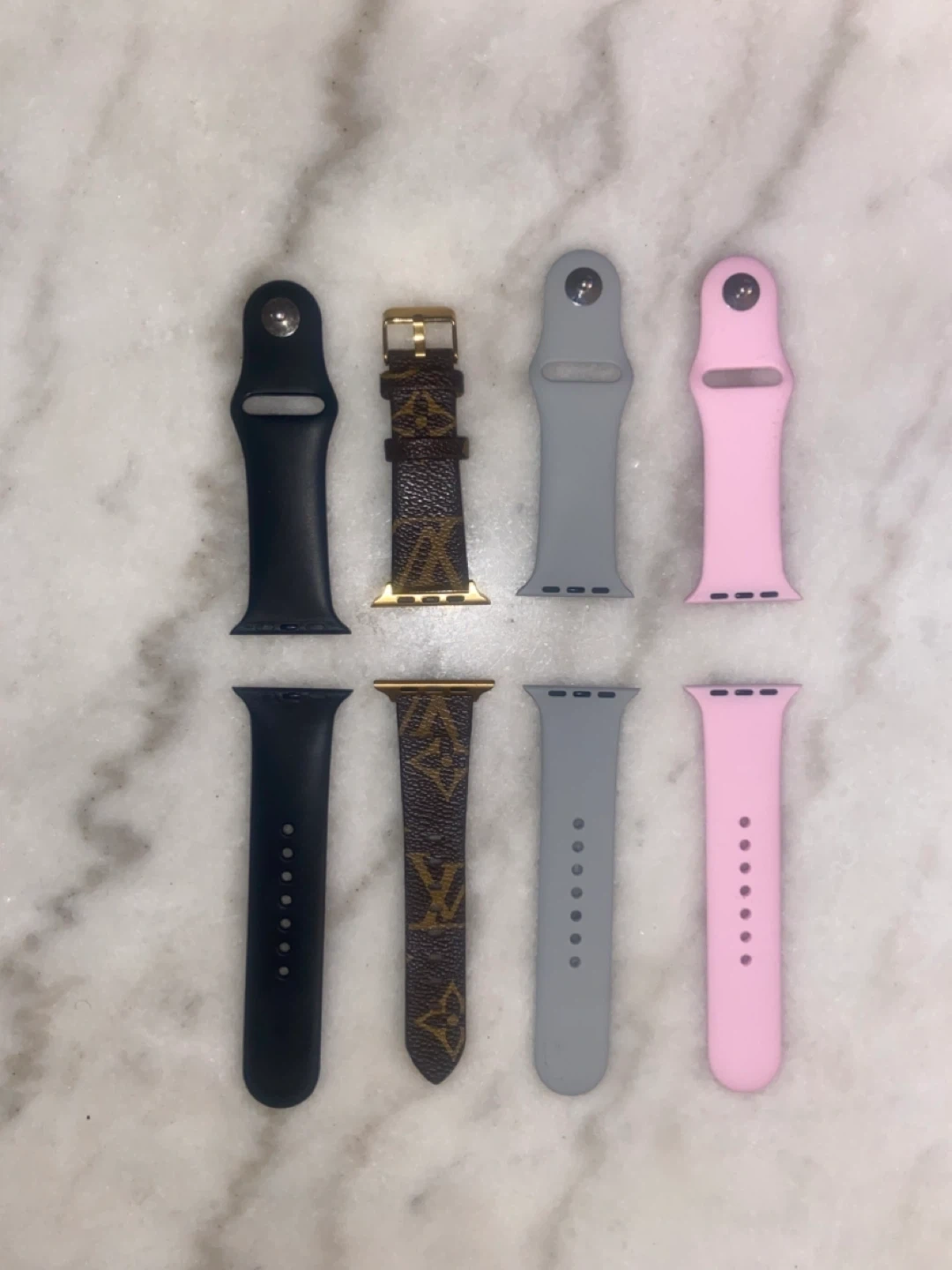 Selling a collection of Apple Watch bands in various colours and styles. There's a black band, a grey band, a pink band, and a patterned band. Perfect for switching up your look! 42mm size