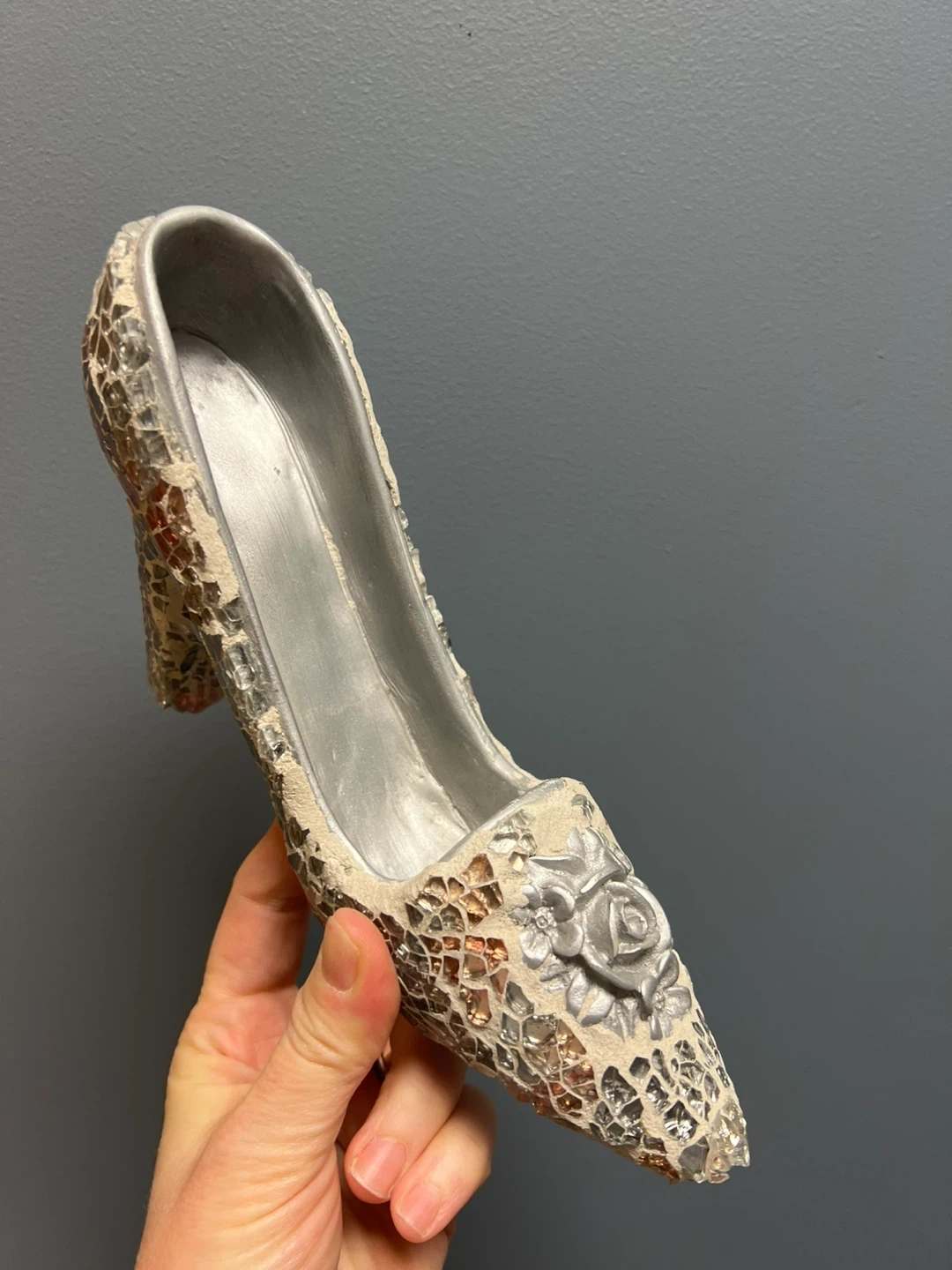 This is a decorative high heel shoe figurine with a mosaic tile finish. It features intricate detailing with a rose embellishment on the toe. It's suitable for display or as a unique accent piece.