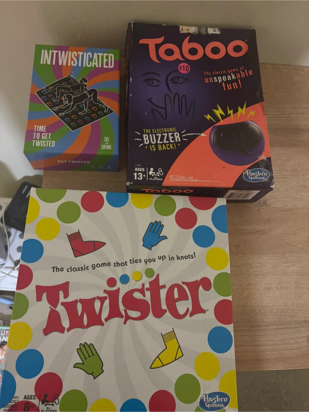 Bundle of three party games from Hasbro Gaming: Taboo with electronic buzzer, Twister, and Intwisticated. Suitable for ages 13+ and 2+ players. Fun for game nights!