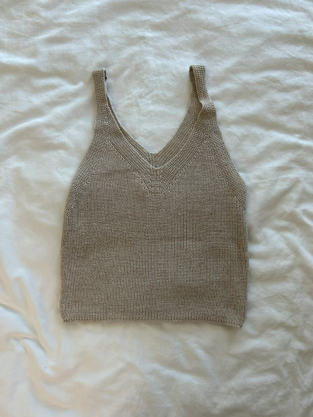 Selling a cute knit tank top! It's a neutral beige colour, perfect for layering or wearing on its own during warmer weather. The material is soft and comfortable, making it a great addition to any wardrobe