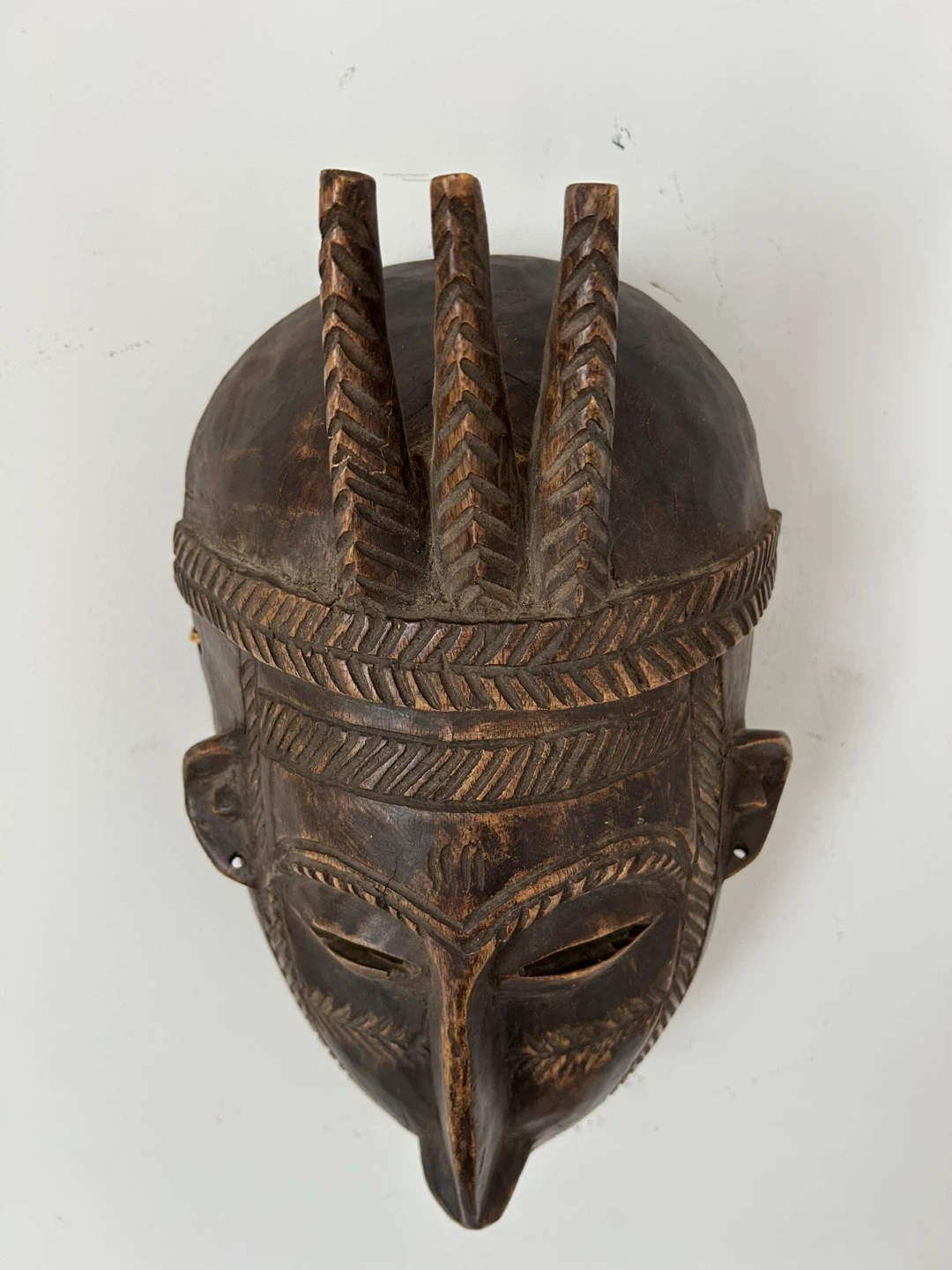 This beautifully sculpted piece features an elongated face, three vertical spikes above the head, and detailed geometric scarification carvings on the forehead and cheeks — classic elements associated with N’tomo symbolism and early initiation traditions. The dark-stained wood has a rich natural patina that enhances its depth and character. Original hanging twine is still attached on the back.