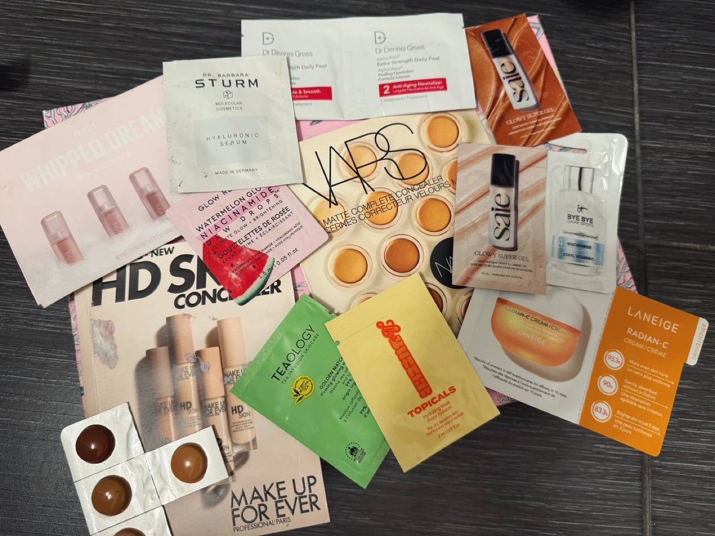 • Assorted foundation, concealer, and skincare samples as shown in photos