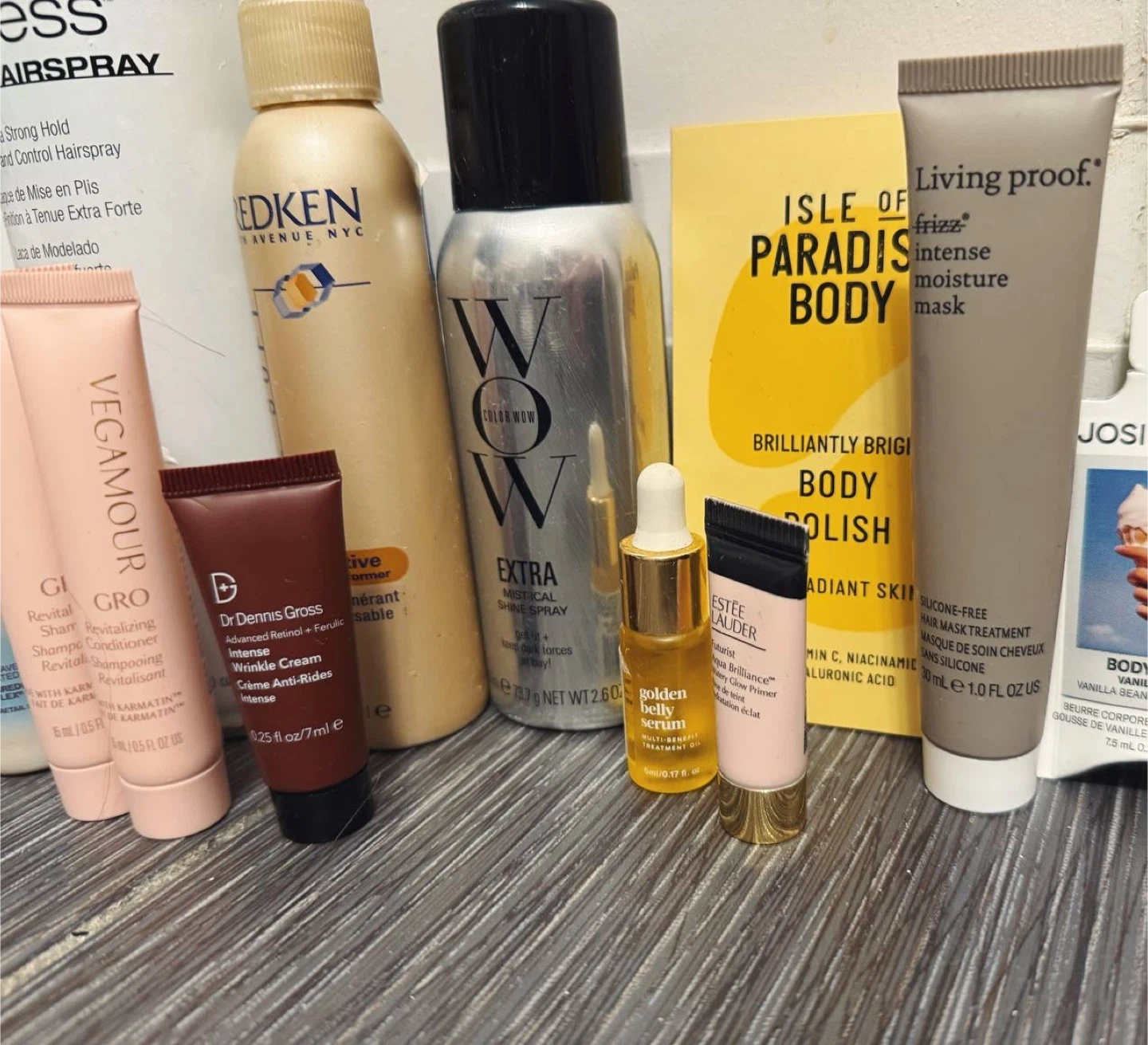 ✅ Big mixed beauty bundle as shown in the photos. Includes headbands, makeup and skincare samples, minis, and hair products — perfect for trying different brands at an affordable price.