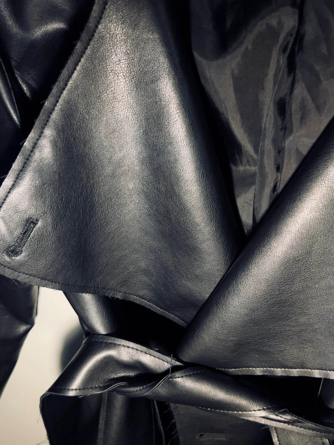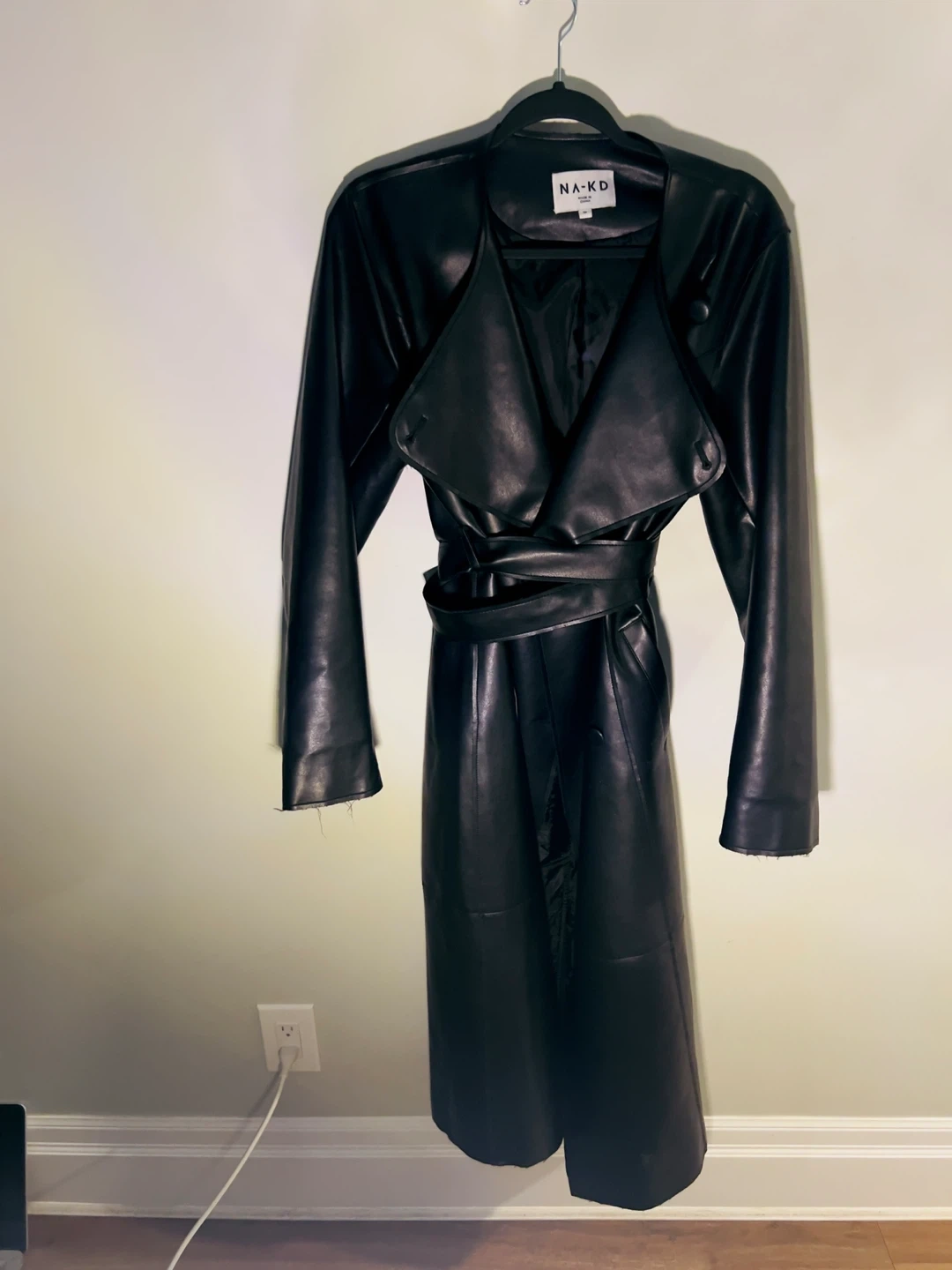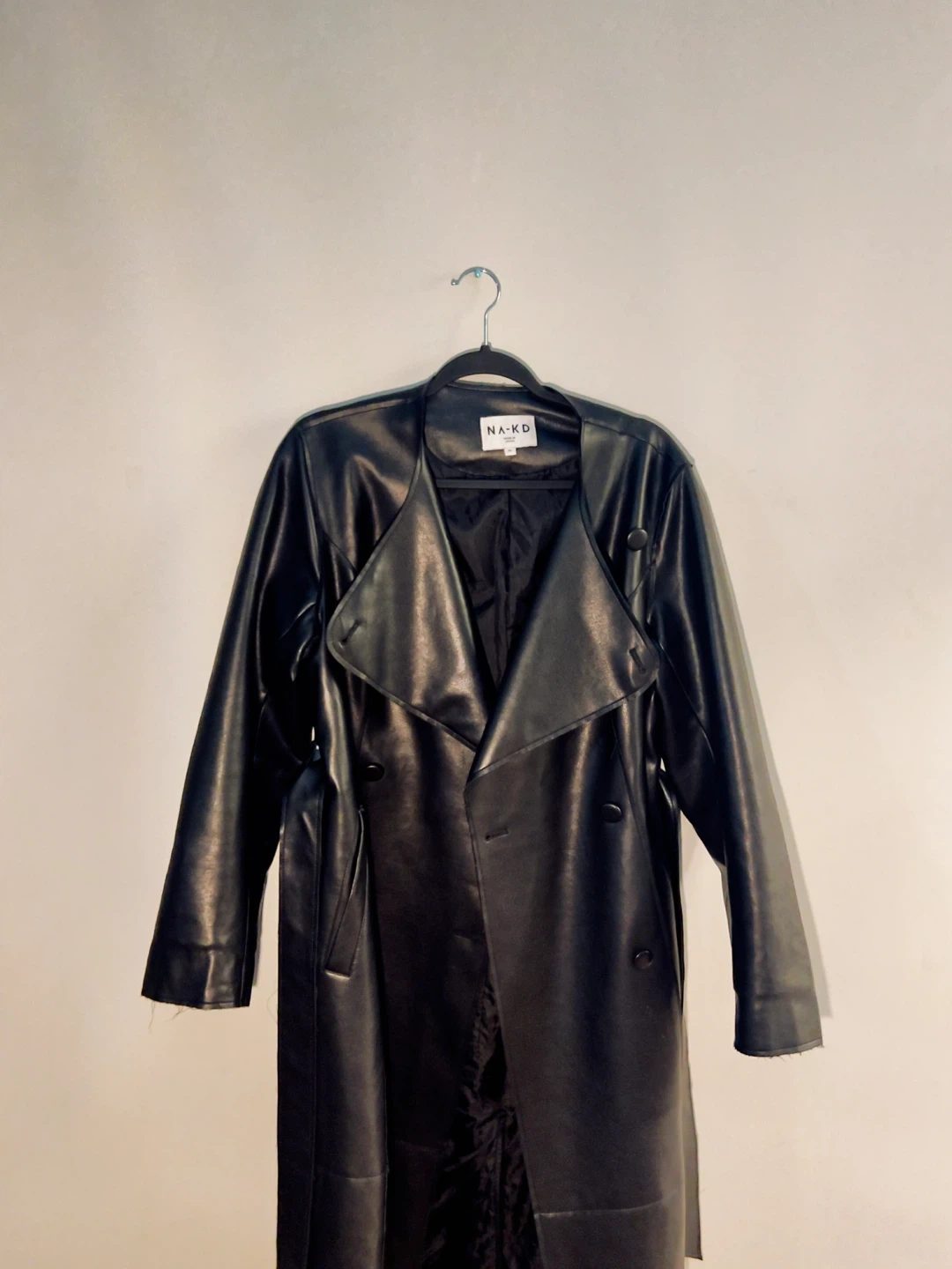 A sleek black faux leather trench coat by NA-KD. It features a tie waist and a classic collar. Longline, oversized fit. Size Small. Perfect for autumn & spring.