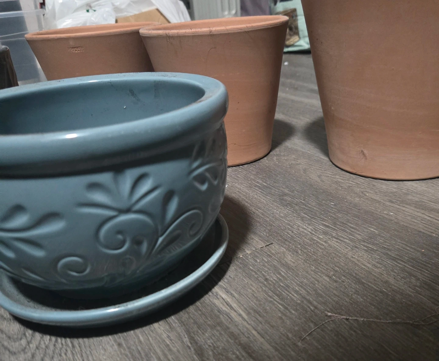 ● 3 Terracota pots ( One large 8" diameter by 7.5" height , Two small 6" diameter by 5.5" height)
