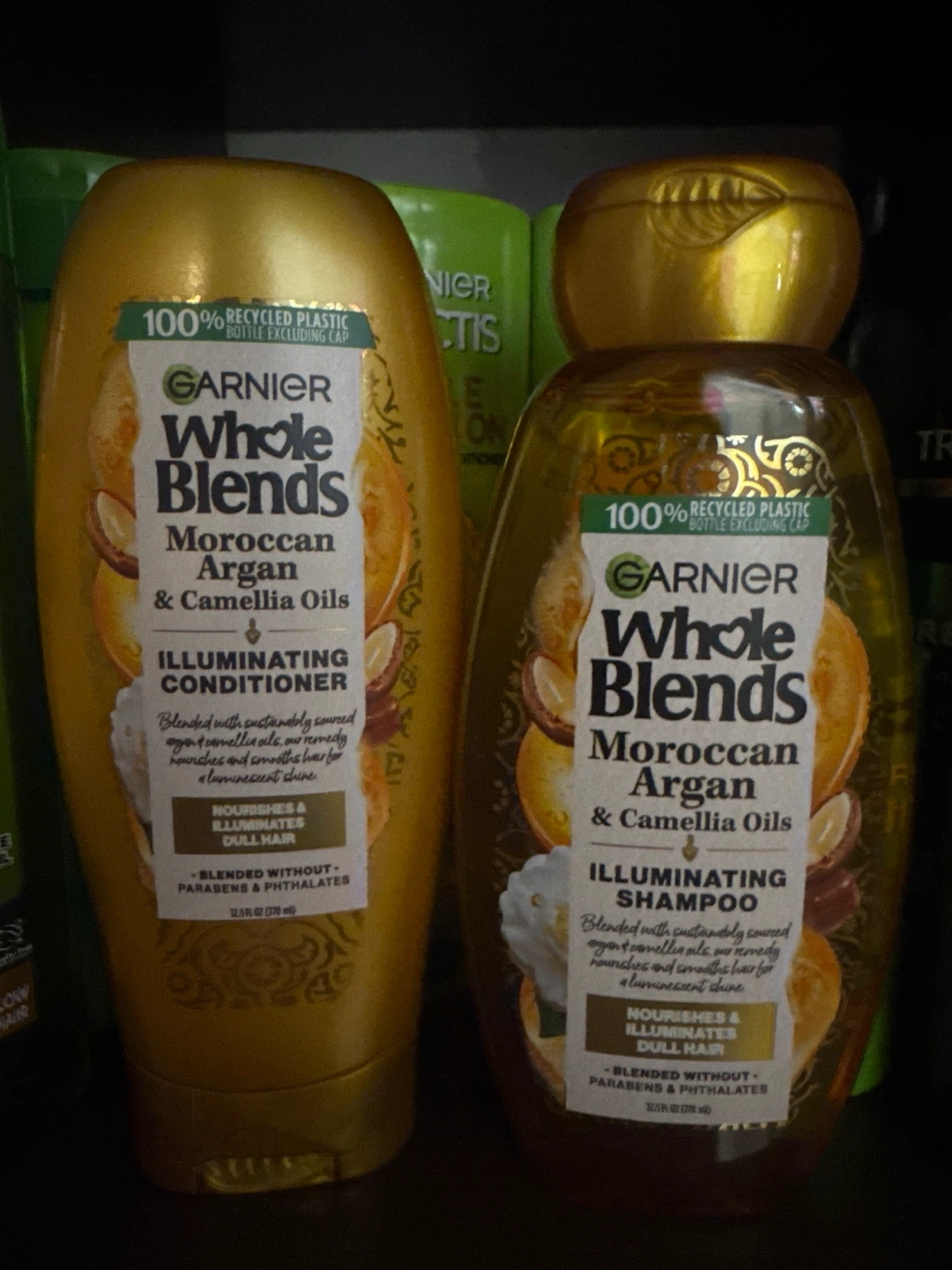 Selling a set of Garnier Whole Blends Moroccan Argan & Camellia Oils Illuminating Shampoo and Conditioner! Both bottles are made with 100% recycled plastic (excluding the cap) and are blended without parabens and phthalates. The conditioner is 12.5 fl oz (370 ml). They nourish and illuminate dull hair, leaving it feeling smooth and looking shiny