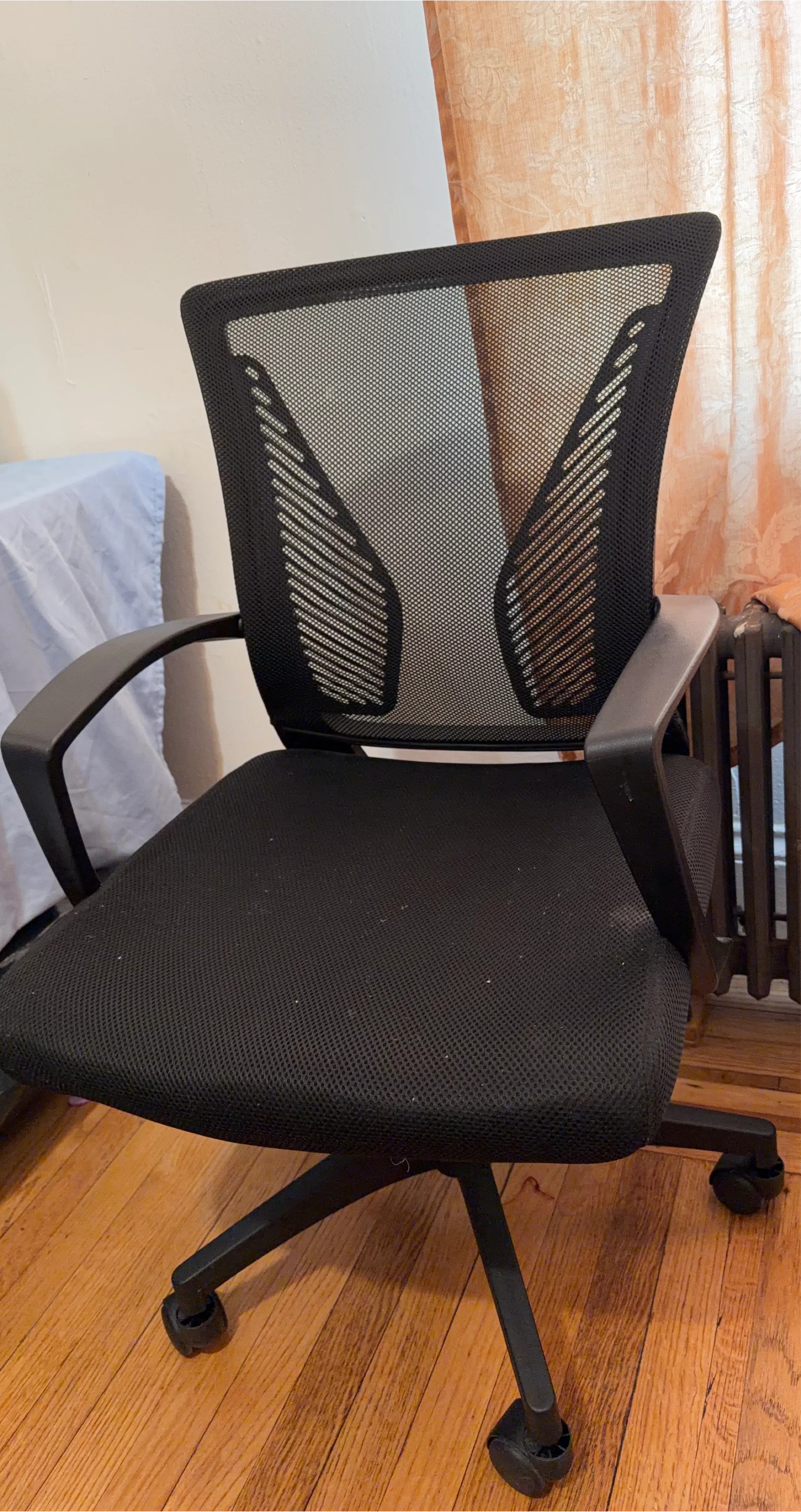 This is a black mesh office chair with armrests. It features a breathable mesh back and a padded seat for comfort. The chair has a five-star base with wheels for easy mobility.
