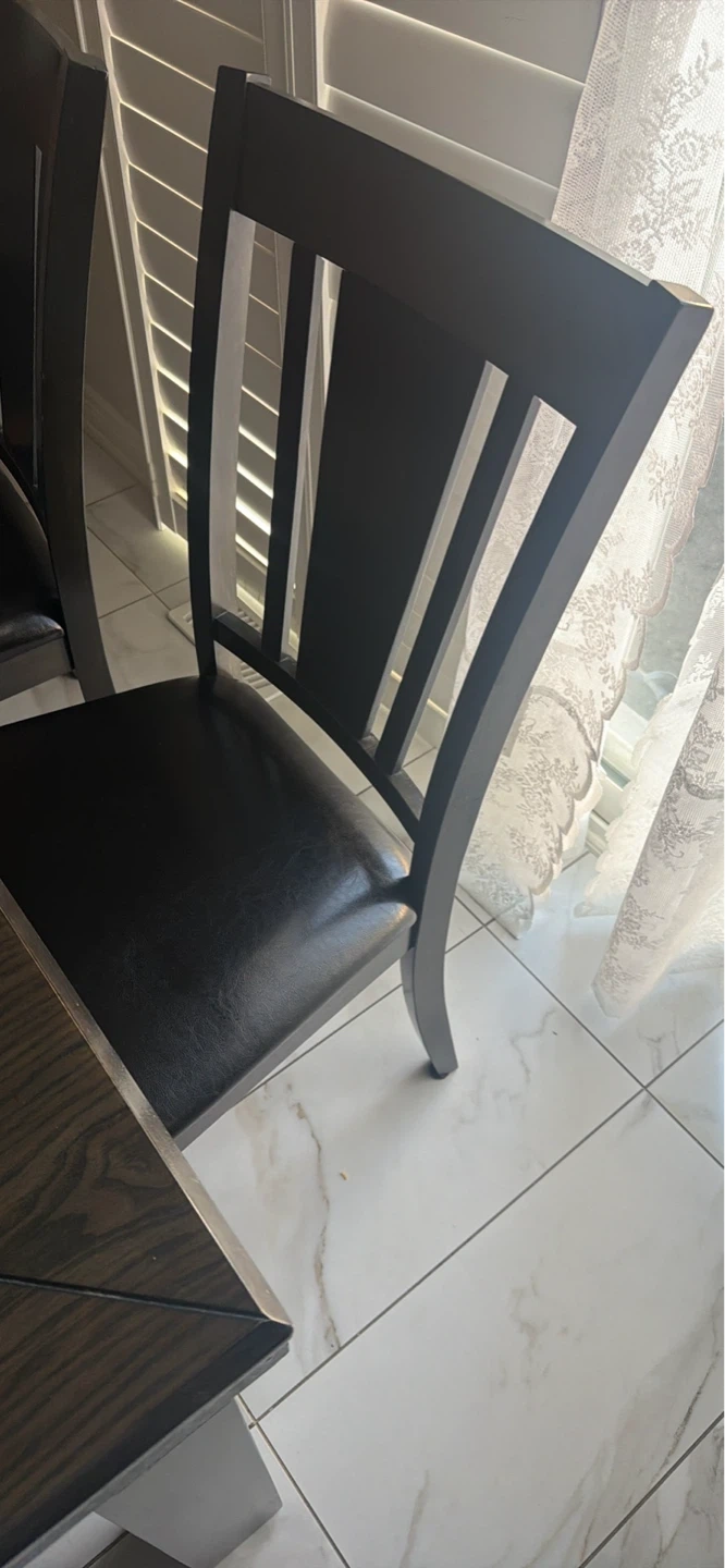 A dark wood dining table with four matching chairs. The table has a modern design with clean lines. The chairs are upholstered in black faux leather.