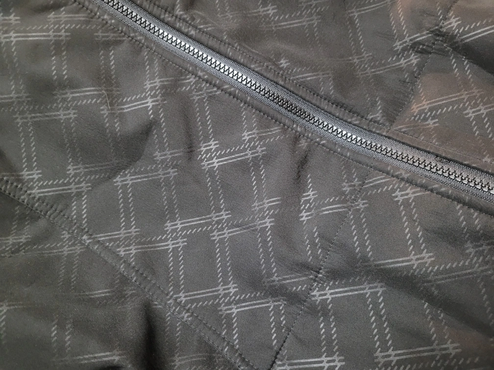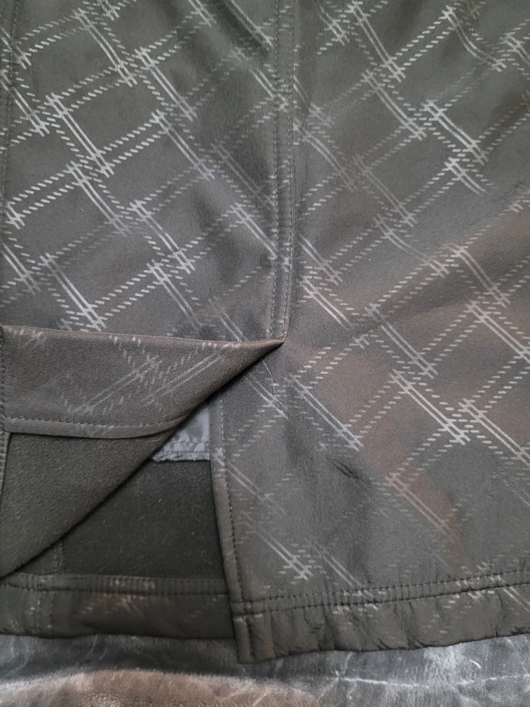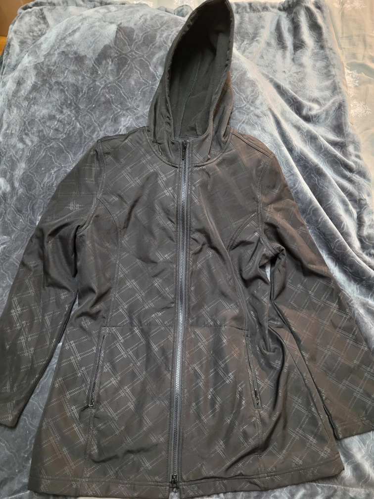 A fleece-lined black jacket, great for autumn temperatures. Features a plaid-like pattern. Comes with a hood. Size Large.