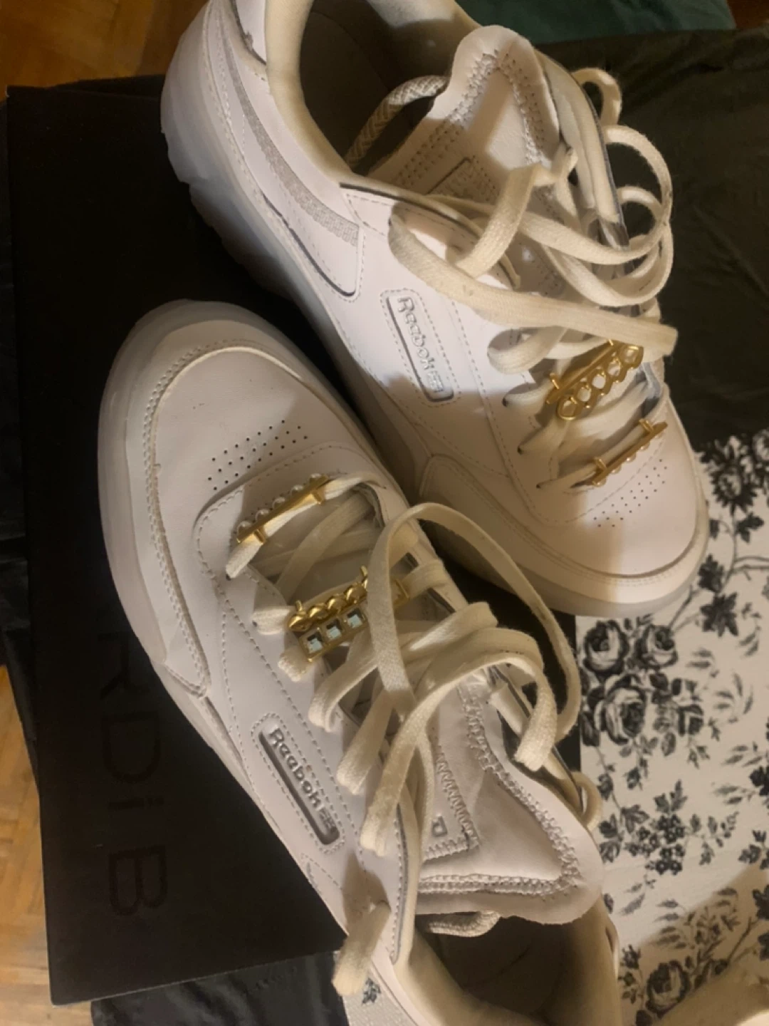 🥕These white leather Cardi B Reebok Club C Revenge platform sneakers have a chunky translucent sole and gold chain accents on the laces. They're a stylish take on a classic design. The shoes feature a leather upper and a rubber outsole.$40