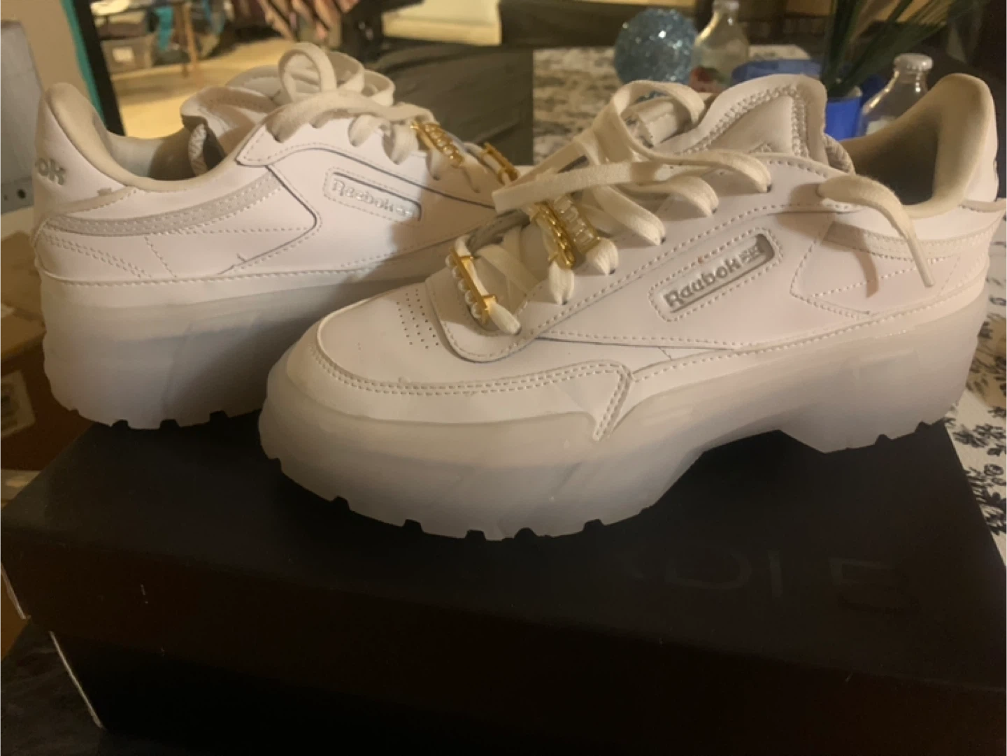 🥕These white leather Cardi B Reebok Club C Revenge platform sneakers have a chunky translucent sole and gold chain accents on the laces. They're a stylish take on a classic design. The shoes feature a leather upper and a rubber outsole.$40