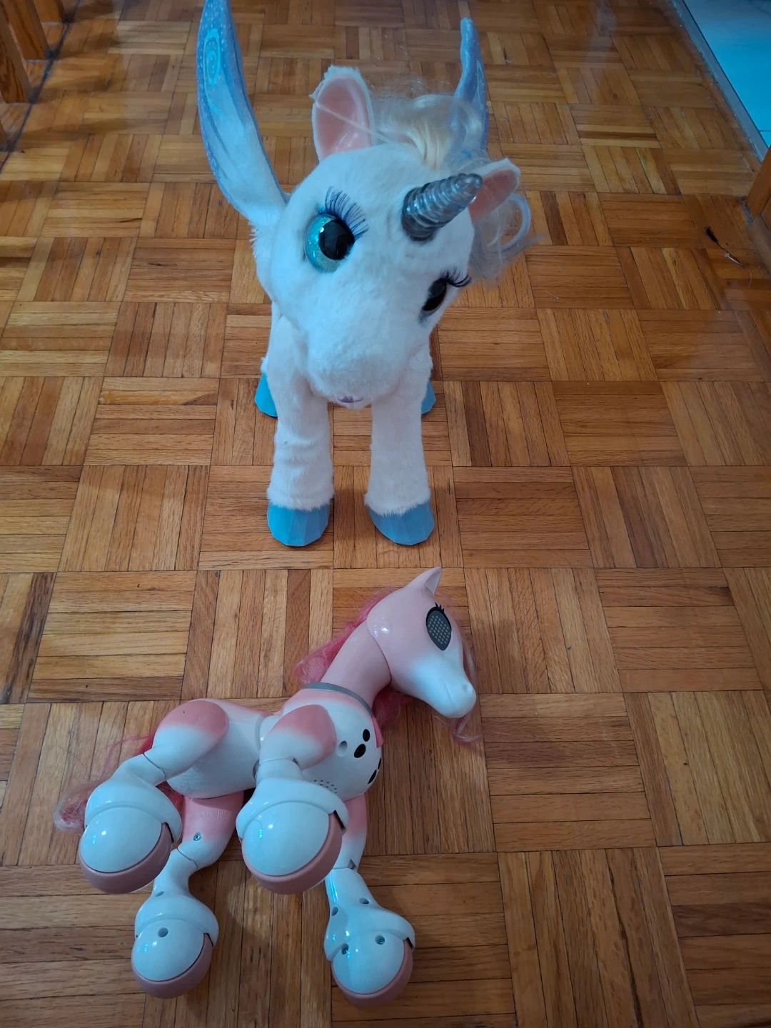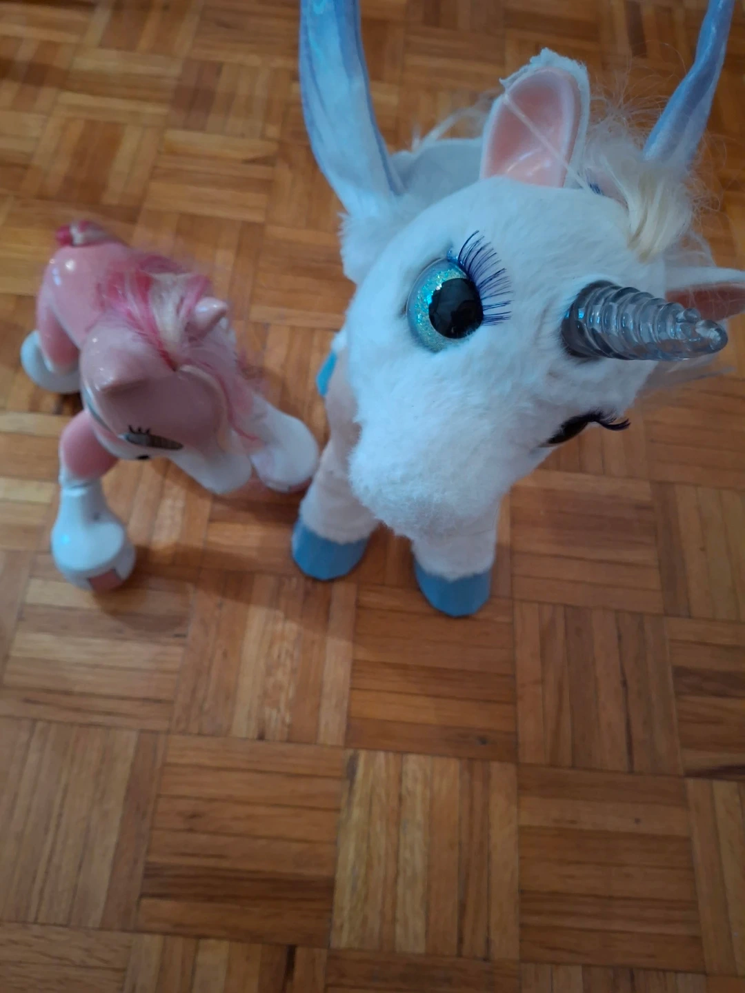Selling these two interactive toys together! One is a white unicorn with blue accents and the other is a pink pony. They're both in good condition and ready for a new home!