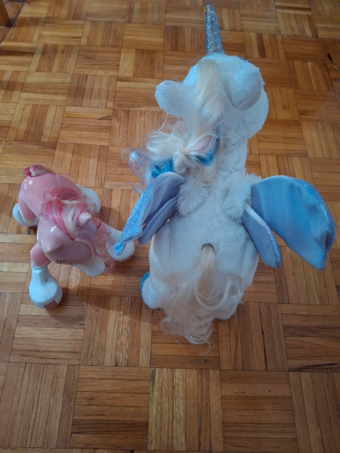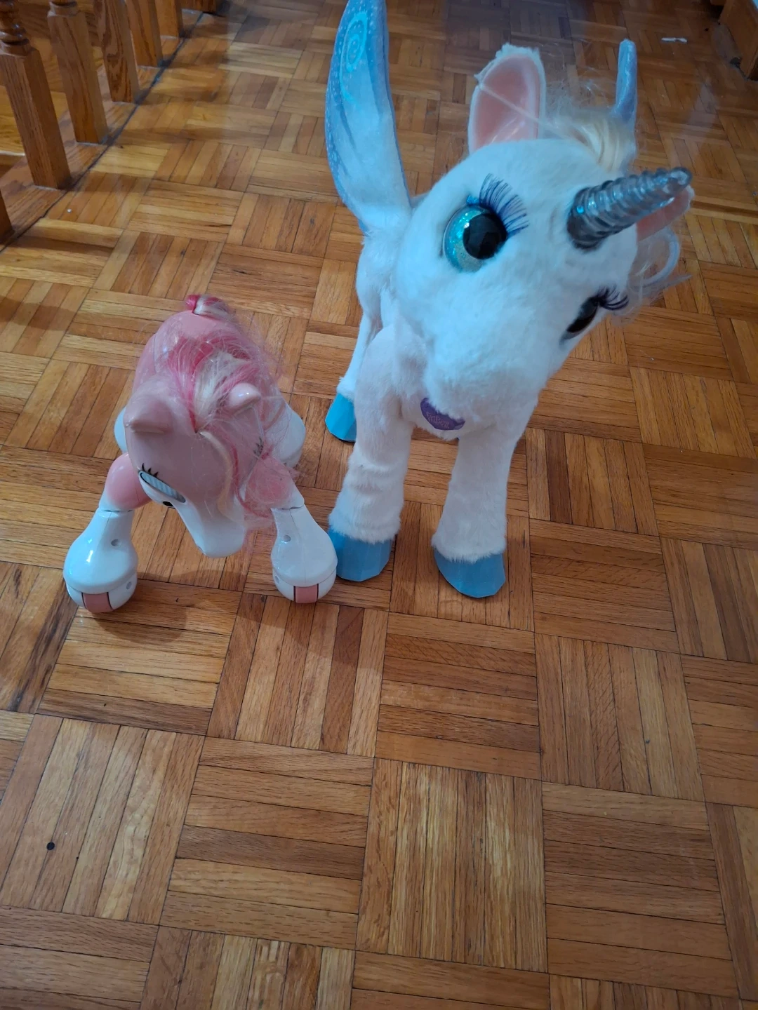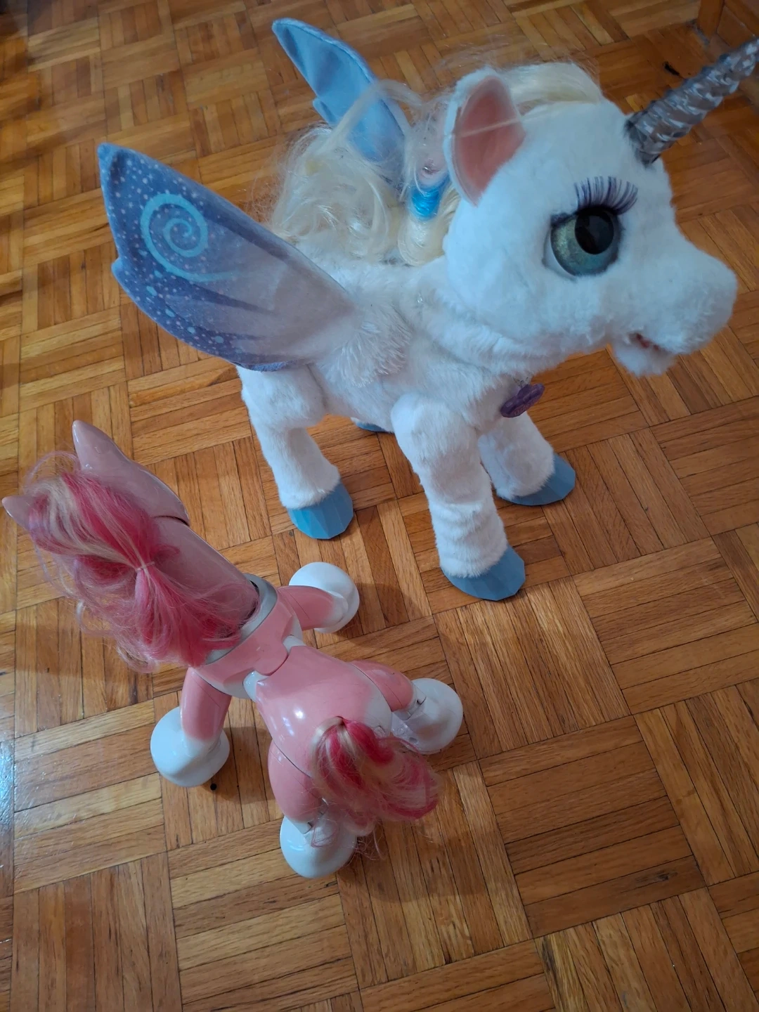 Selling these two interactive toys together! One is a white unicorn with blue accents and the other is a pink pony. They're both in good condition and ready for a new home!