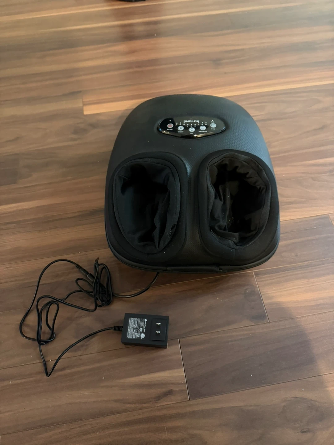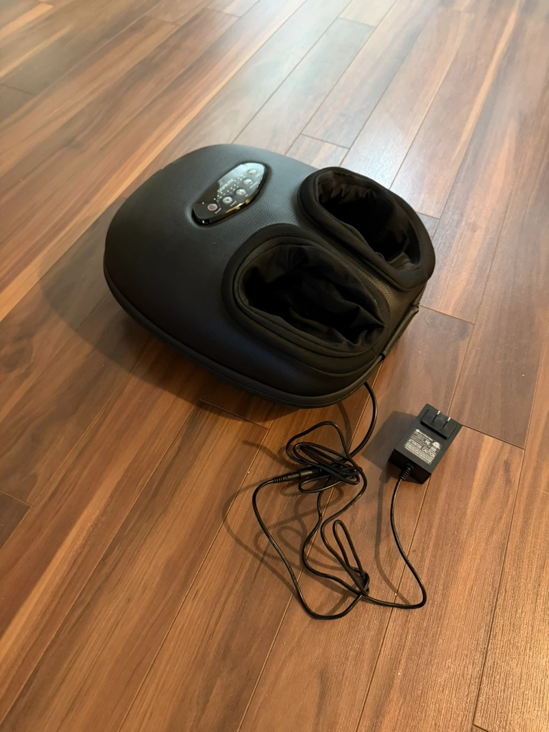 This is electric foot massager with a cord and adapter. It has multiple settings for intensity and massage type with heat or non heat option. It's designed to provide a relaxing foot massage experience.