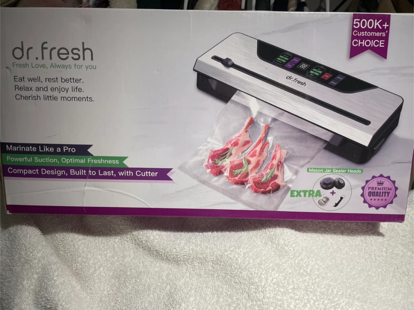 Dr. Fresh vacuum sealer for marinating like a pro. It's designed for powerful suction and optimal freshness. Includes a built-in cutter and extra mason jar sealer heads.