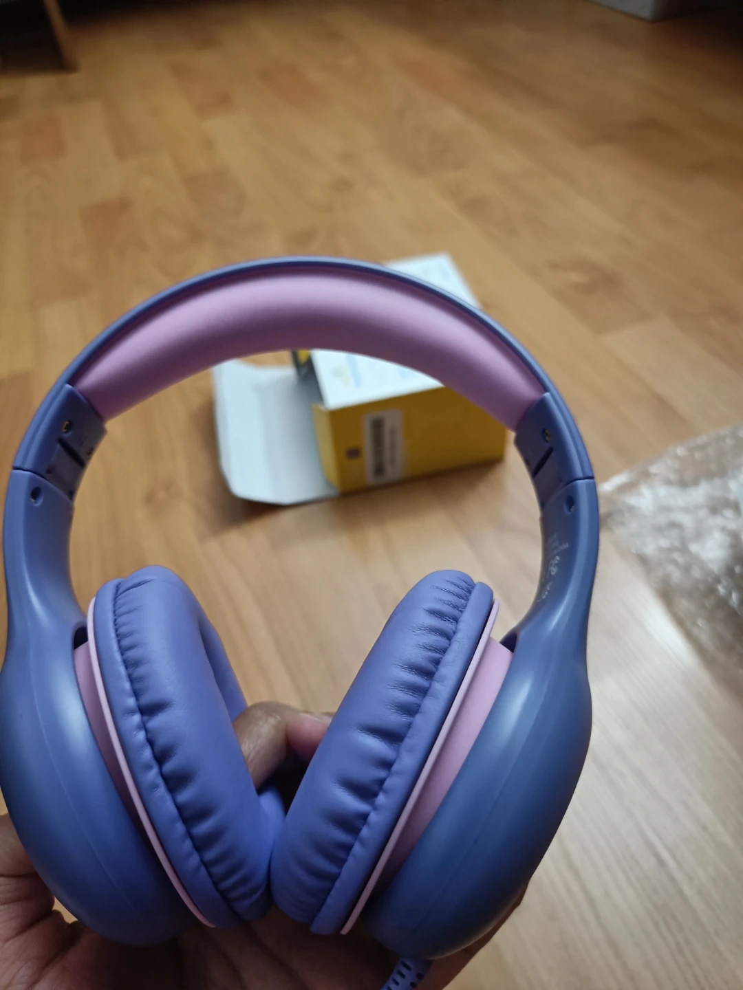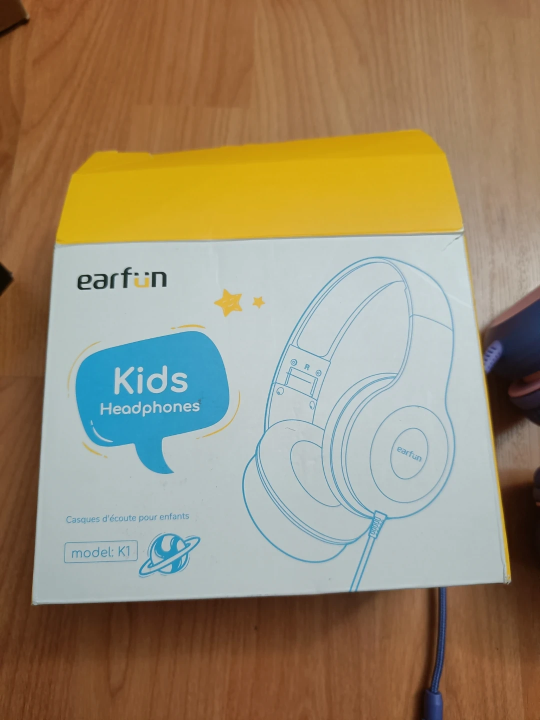 These blue and pink EarFun K1 kids headphones are designed for children. They offer hearing protection and safe materials. It's great for listening to music or audiobooks!