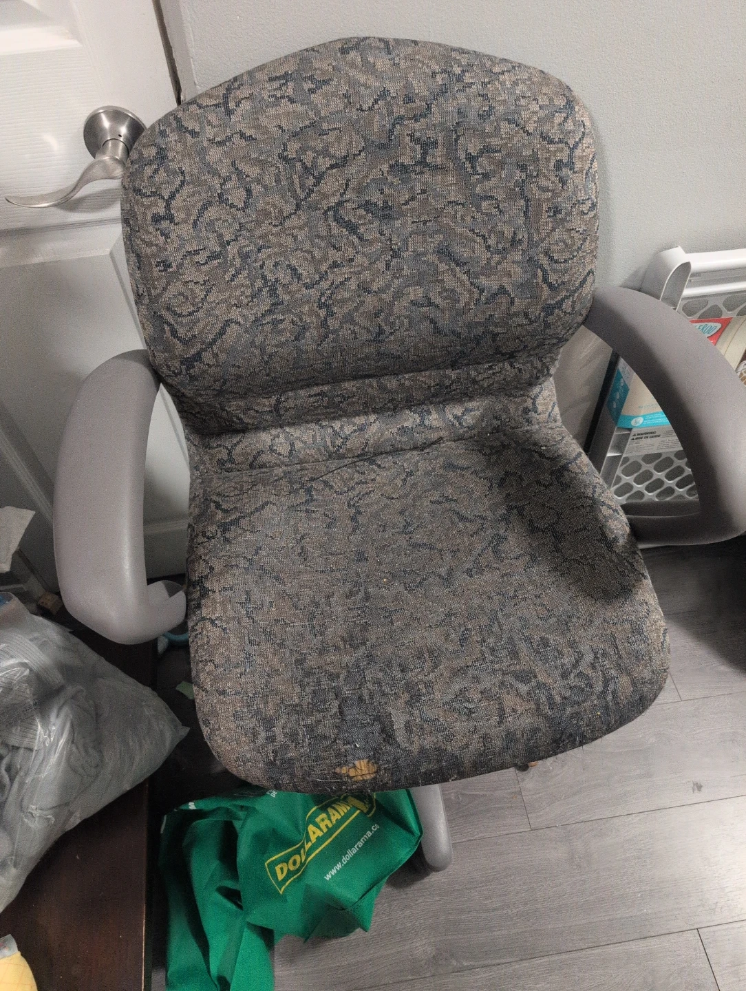 This is a fabric office chair with grey arms. It has a patterned fabric seat and back. Some minor wear is visible on the seat cushion.